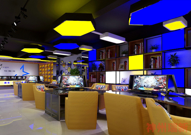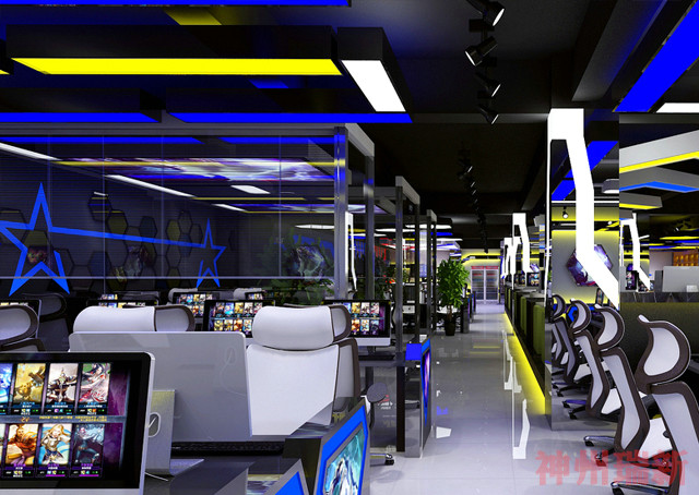 2、網(wǎng)吧吊頂造型:網(wǎng)吧吊頂要結(jié)合整體的布局來做出相應(yīng)的造型, 從而結(jié)合整體的設(shè)計(jì)充分利用頂子上的空間來做一隱蔽性的工程。