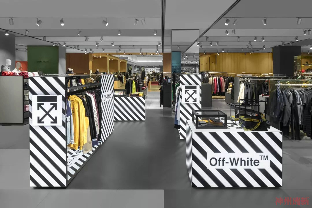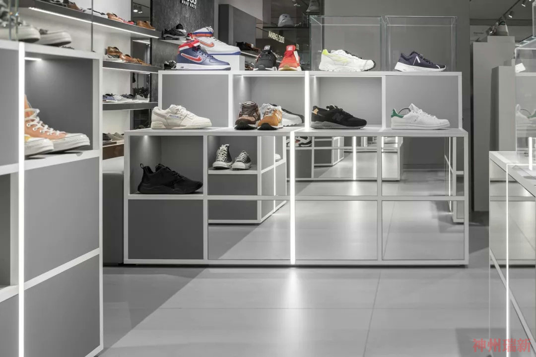 整體的裝修色彩以灰色為主,地面、承重柱、頂面和貨柜貨架串聯起來。把各個品牌的順序跟色彩和種類也融合一起,使店鋪內的每個類別區域都有獨特的色彩和個性。