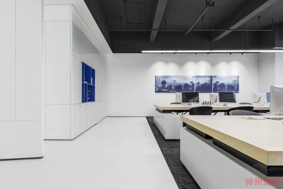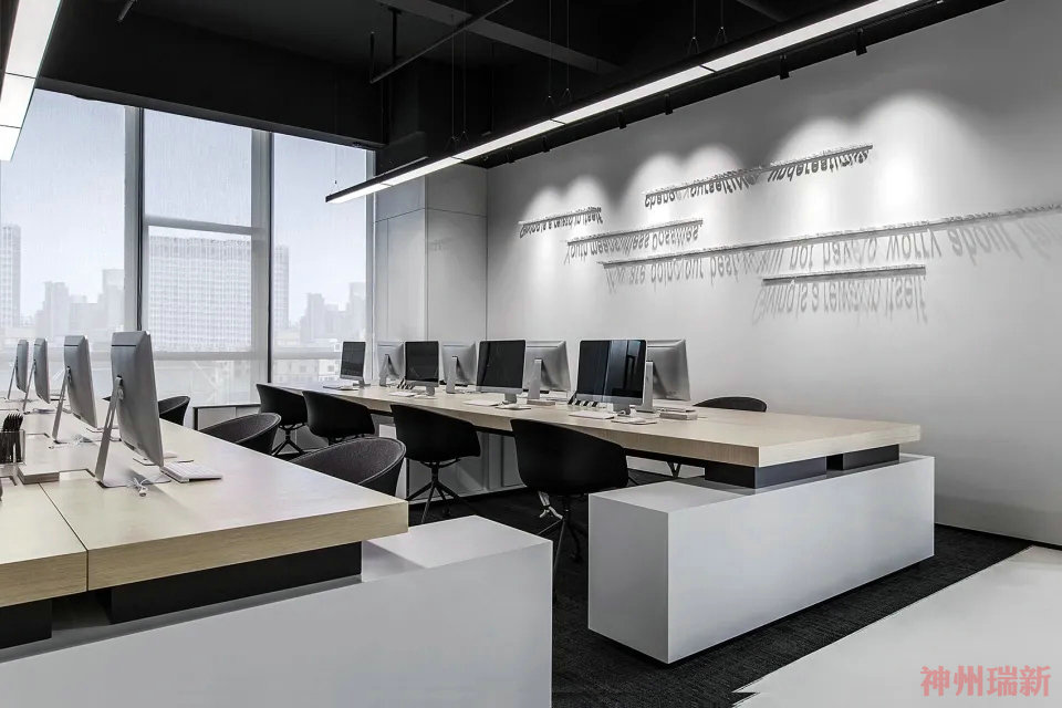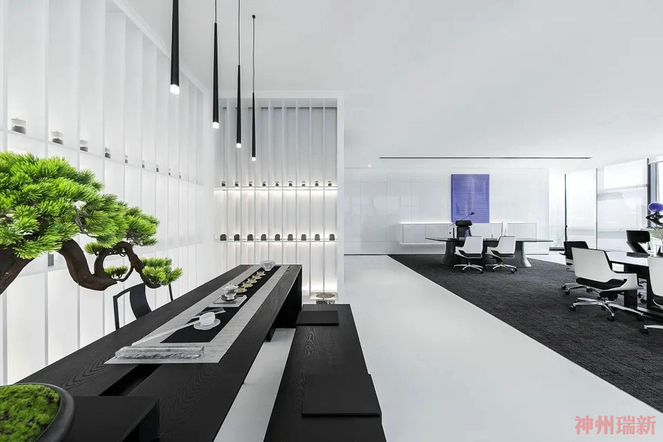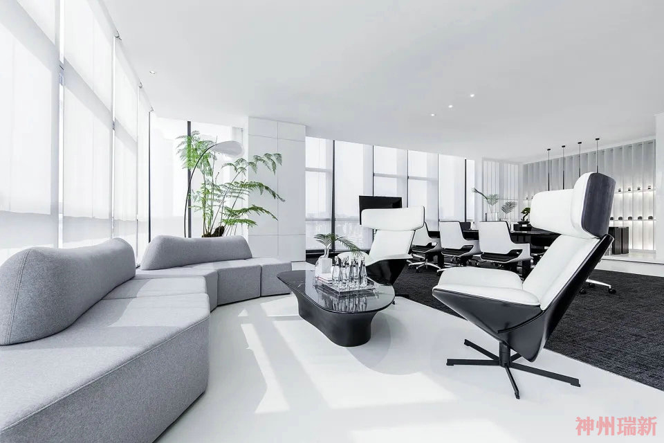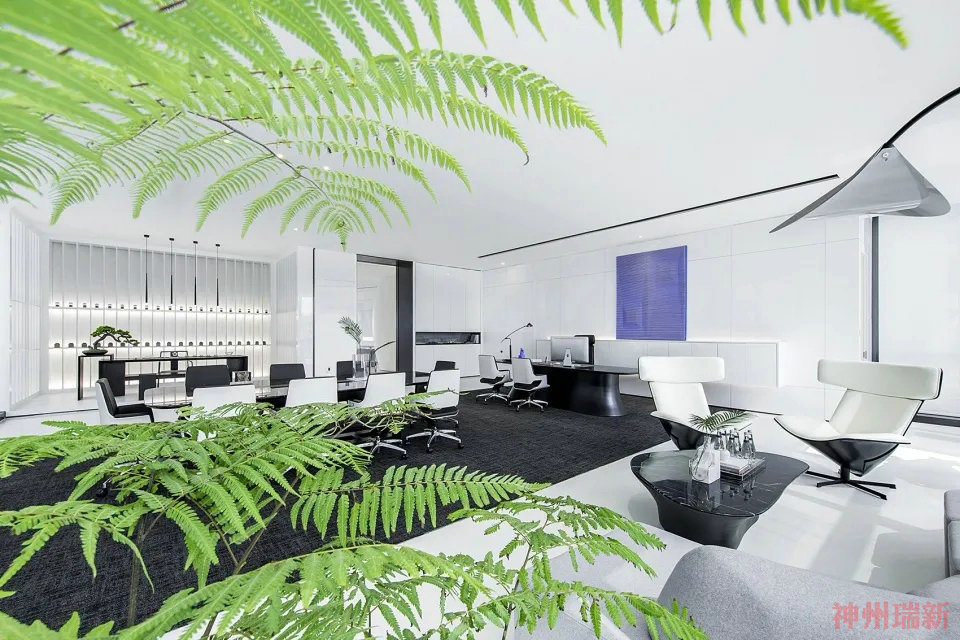 會客休閑區白色軟裝配飾給人以溫潤質感的視覺效果,這種辦公室裝修設計效果讓人感覺身心放松。功能區的各種軟裝配飾以線條美學,簡潔細膩,有規律的美,層次感很明顯,多功能的組合增加空間的趣味性。辦公室辦公區采用了現代風格的裝修設計理念,整潔淡雅,黑白相接,進行綜合的調和,呈現出科技感和現代感。神州瑞新裝飾設計師在辦公室內設計了綠植,豐富了辦公室的綠色健康的理念。