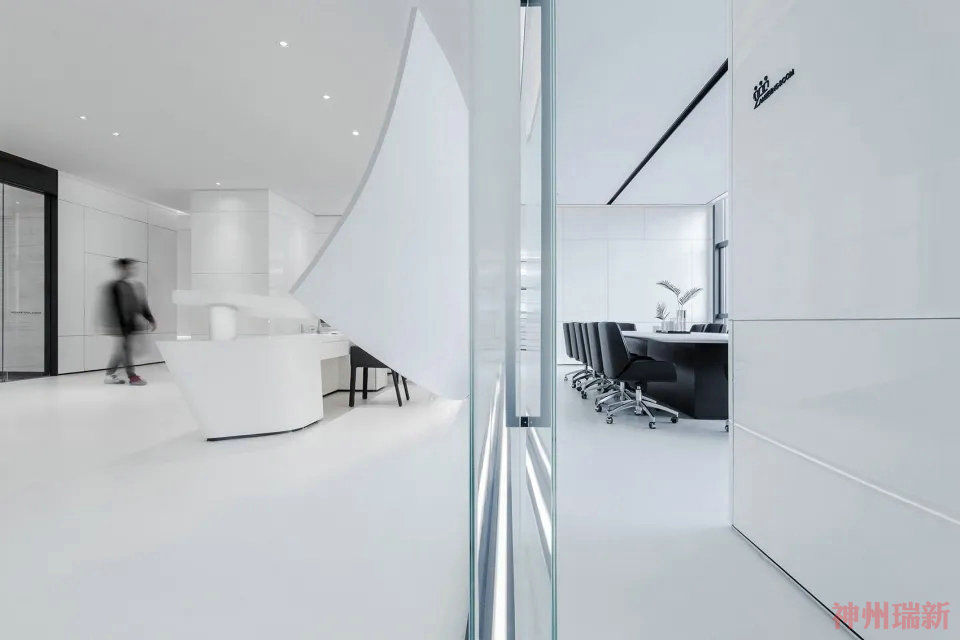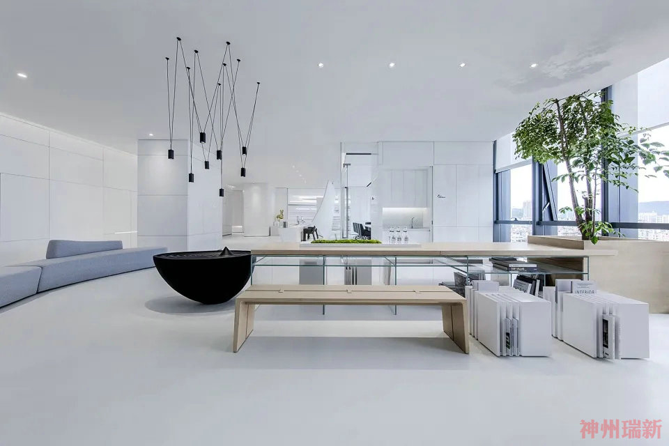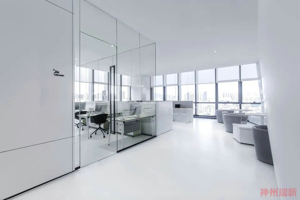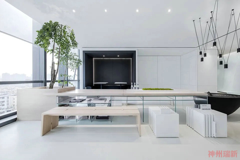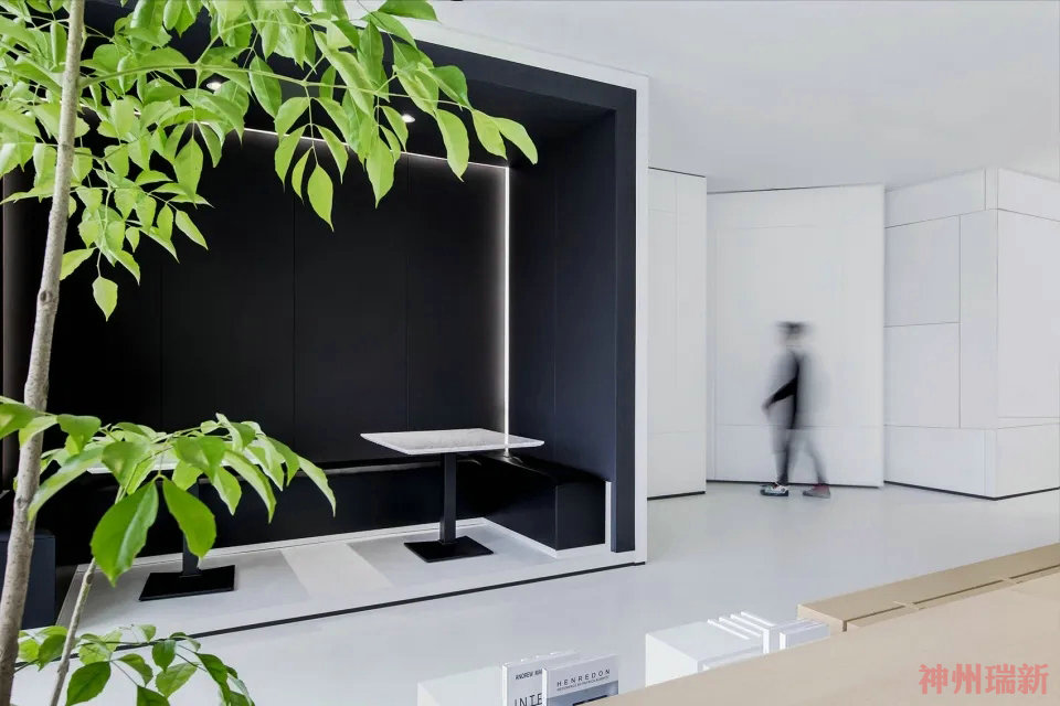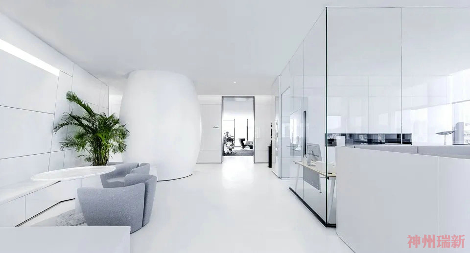 會客休閑區白色軟裝配飾給人以溫潤質感的視覺效果,這種辦公室裝修設計效果讓人感覺身心放松。功能區的各種軟裝配飾以線條美學,簡潔細膩,有規律的美,層次感很明顯,多功能的組合增加空間的趣味性。辦公室辦公區采用了現代風格的裝修設計理念,整潔淡雅,黑白相接,進行綜合的調和,呈現出科技感和現代感。神州瑞新裝飾設計師在辦公室內設計了綠植,豐富了辦公室的綠色健康的理念。