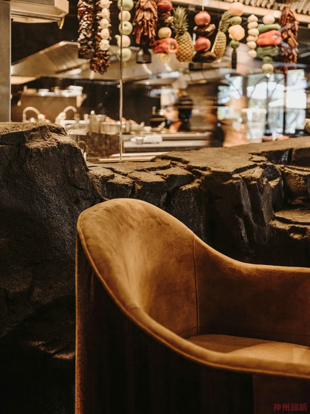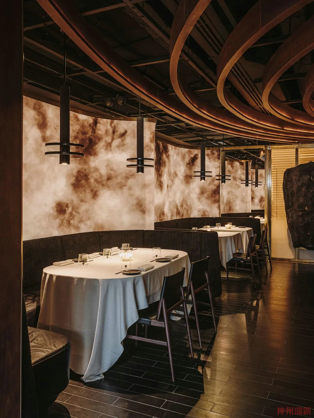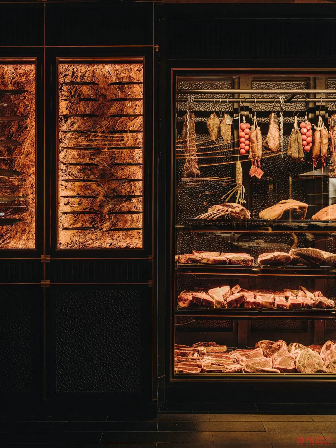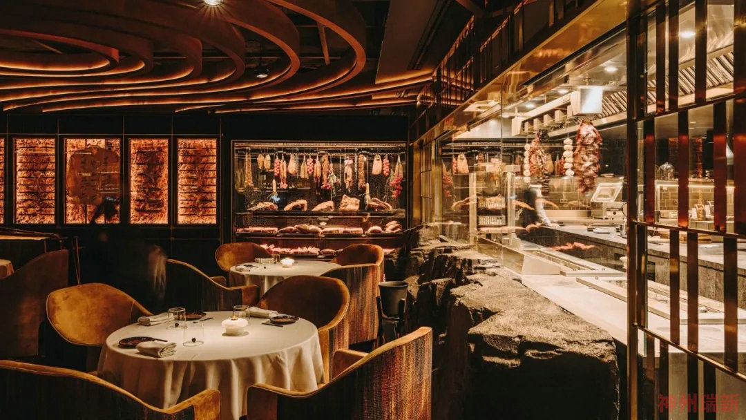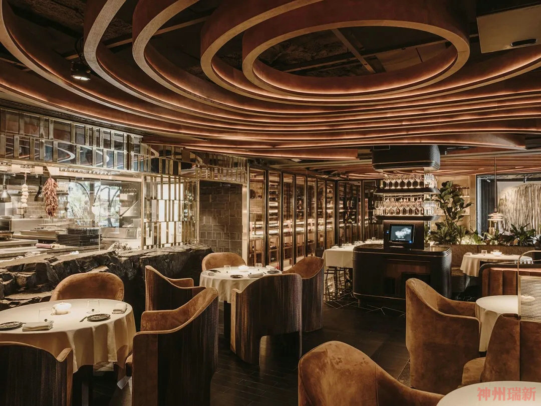 本案是餐飲空間裝修,牛排餐廳裝修設計的其中一個案例,整體設計風格用煙熏和木炭燒烤素材,展現餐廳的木材、石頭和火的原始審美。再經過拋光的巧妙設計,神州瑞新設計師采用原始真實的素材,并以重色和流暢紋理的泥土色調為基礎,使他們想起了在火爐上烹制肉類的原始體驗,而又沒有放棄其現代精致的標志感。
