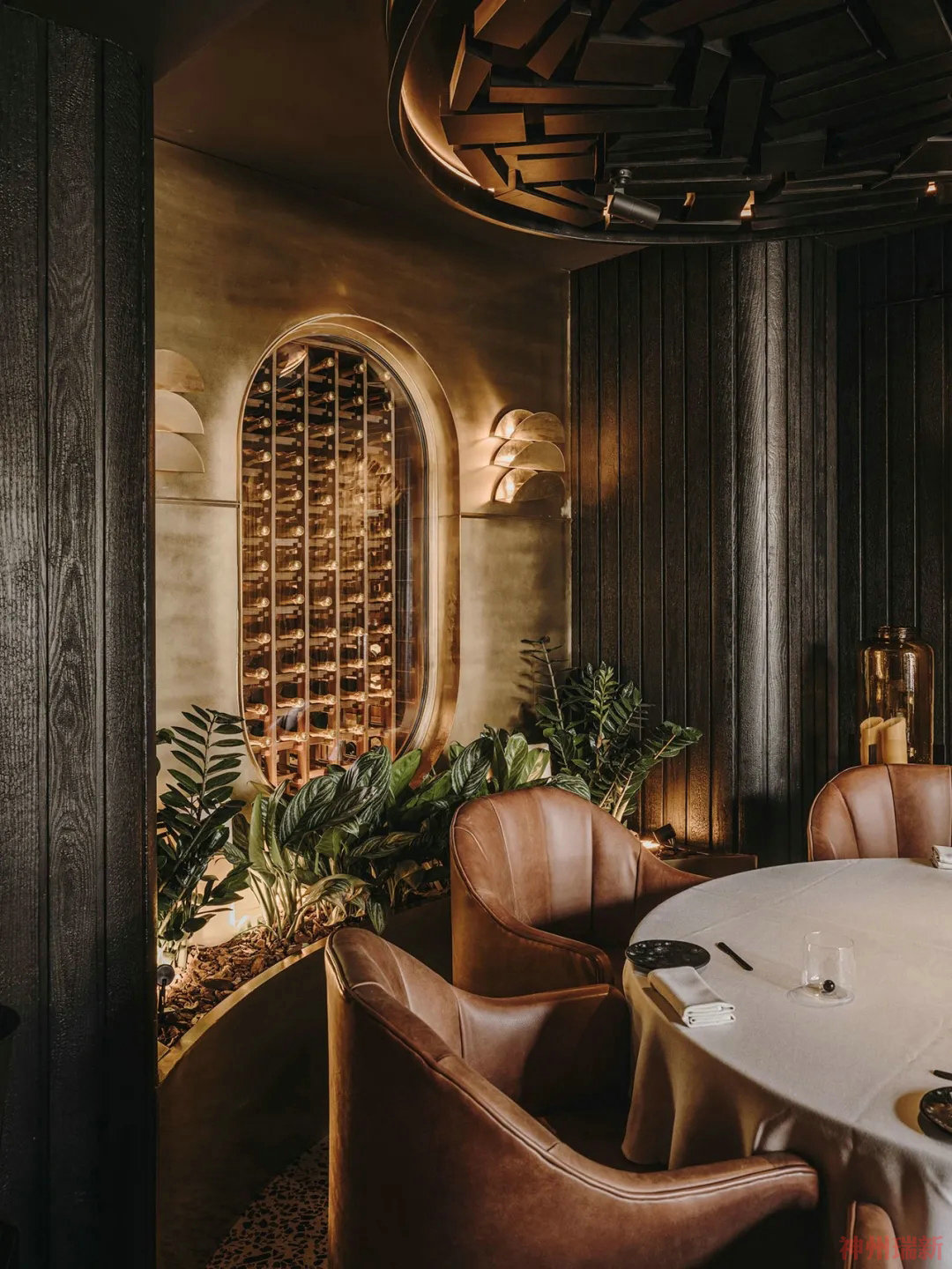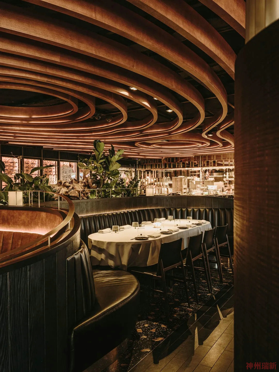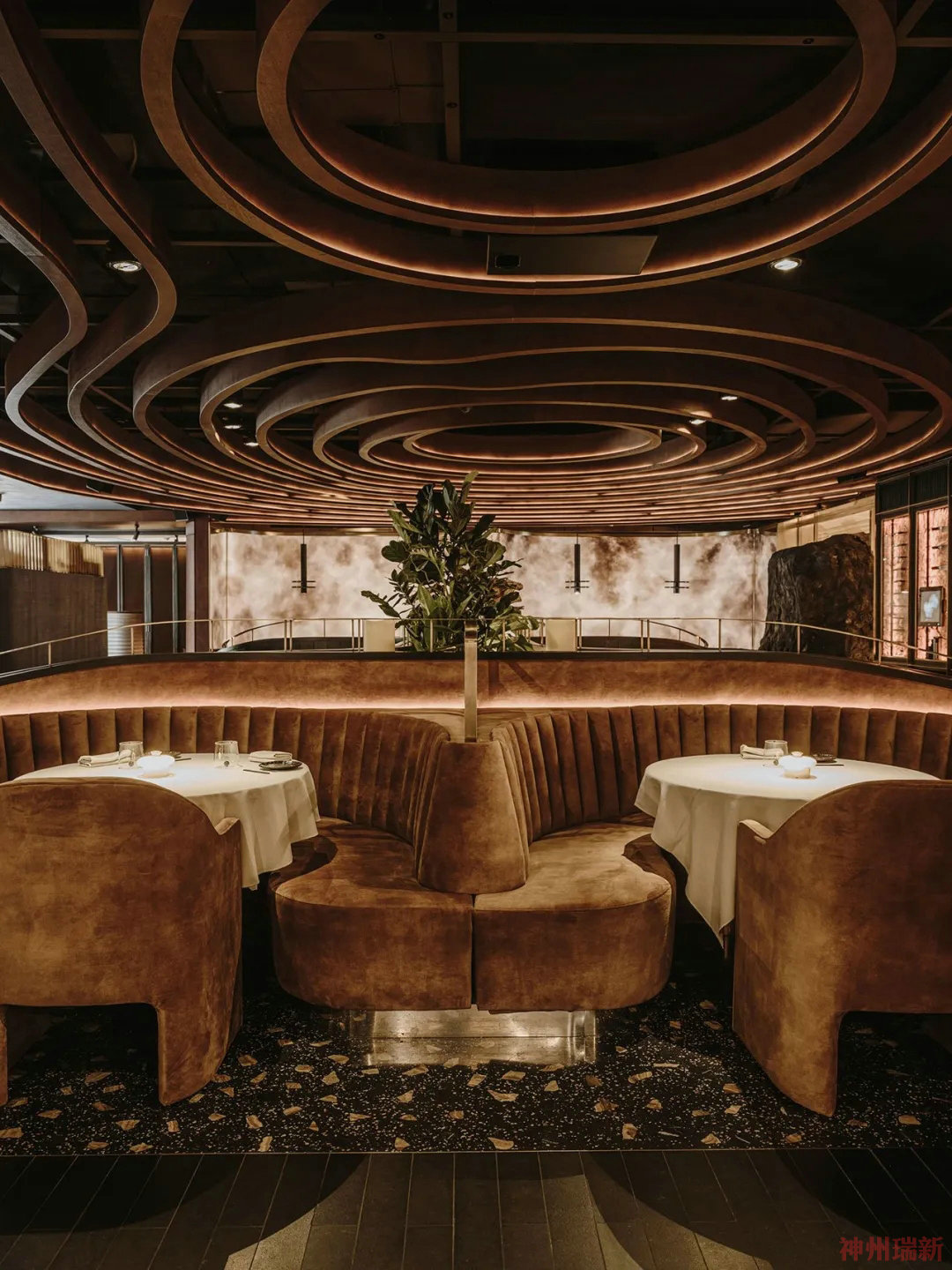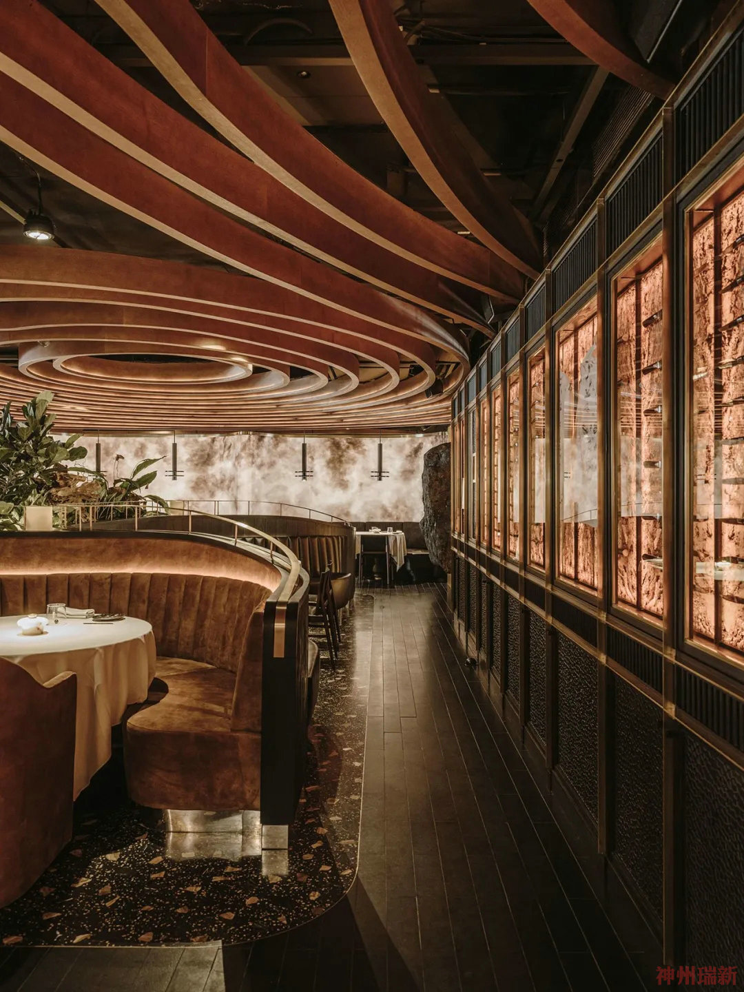 本案是餐飲空間裝修,牛排餐廳裝修設計的其中一個案例,整體設計風格用煙熏和木炭燒烤素材,展現餐廳的木材、石頭和火的原始審美。再經過拋光的巧妙設計,神州瑞新設計師采用原始真實的素材,并以重色和流暢紋理的泥土色調為基礎,使他們想起了在火爐上烹制肉類的原始體驗,而又沒有放棄其現代精致的標志感。