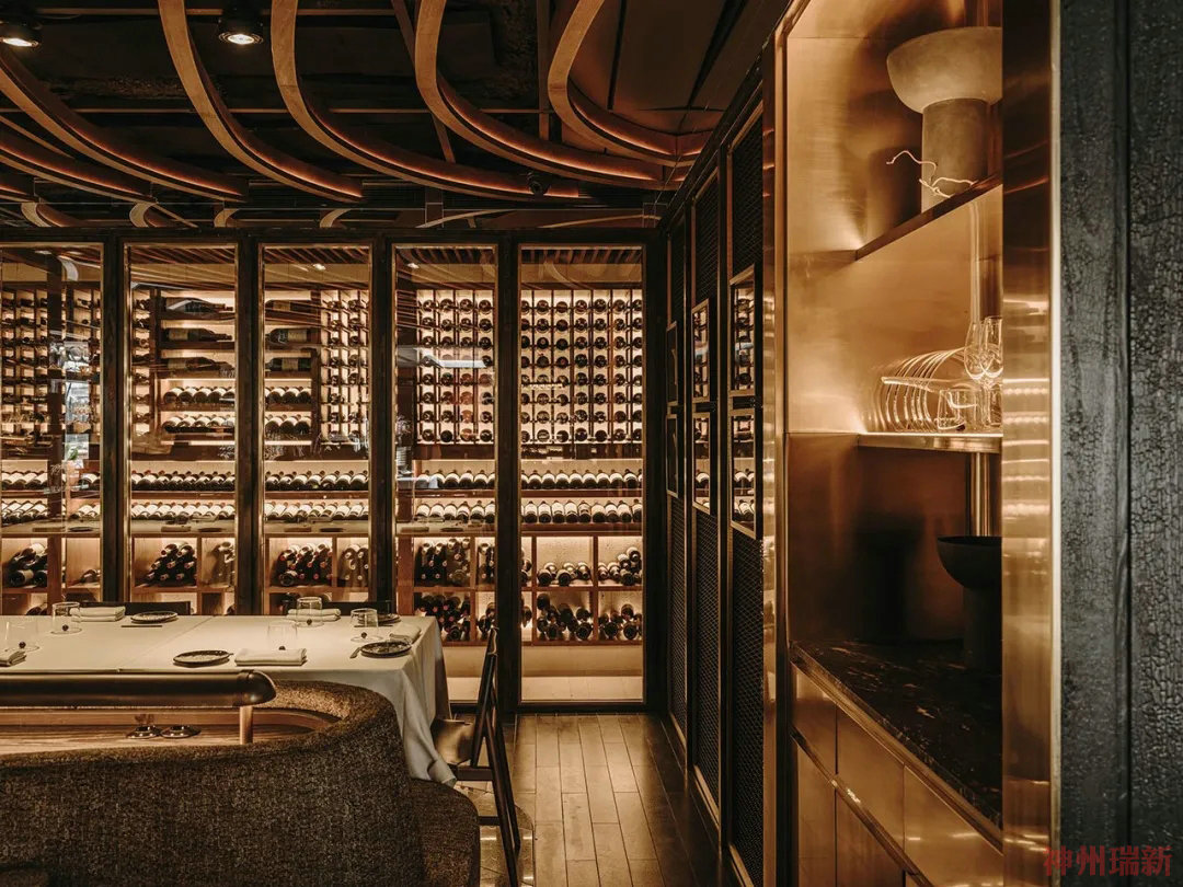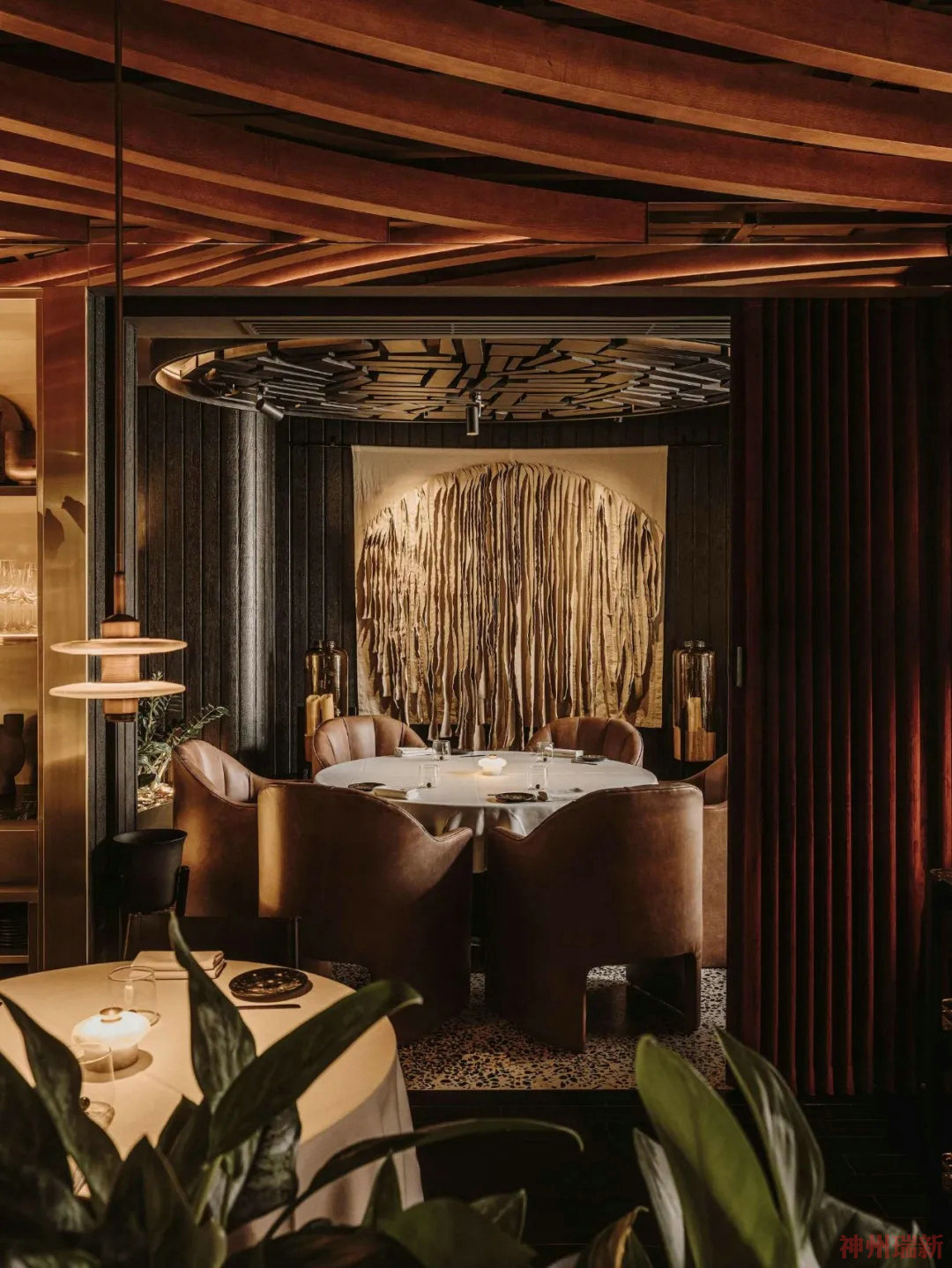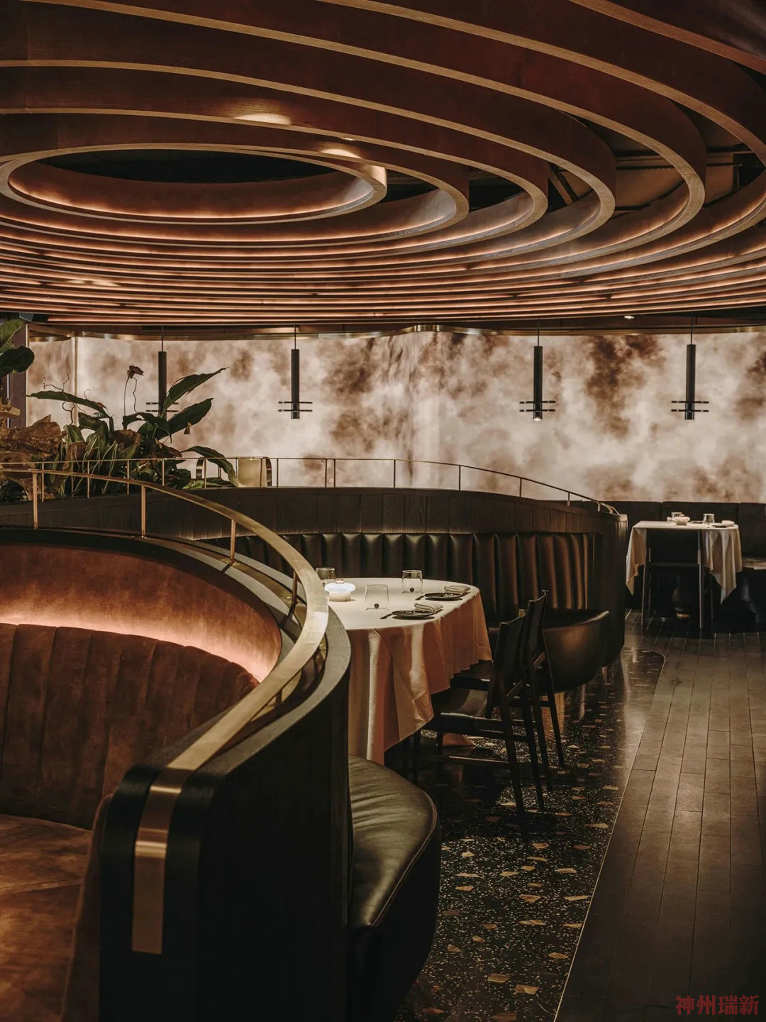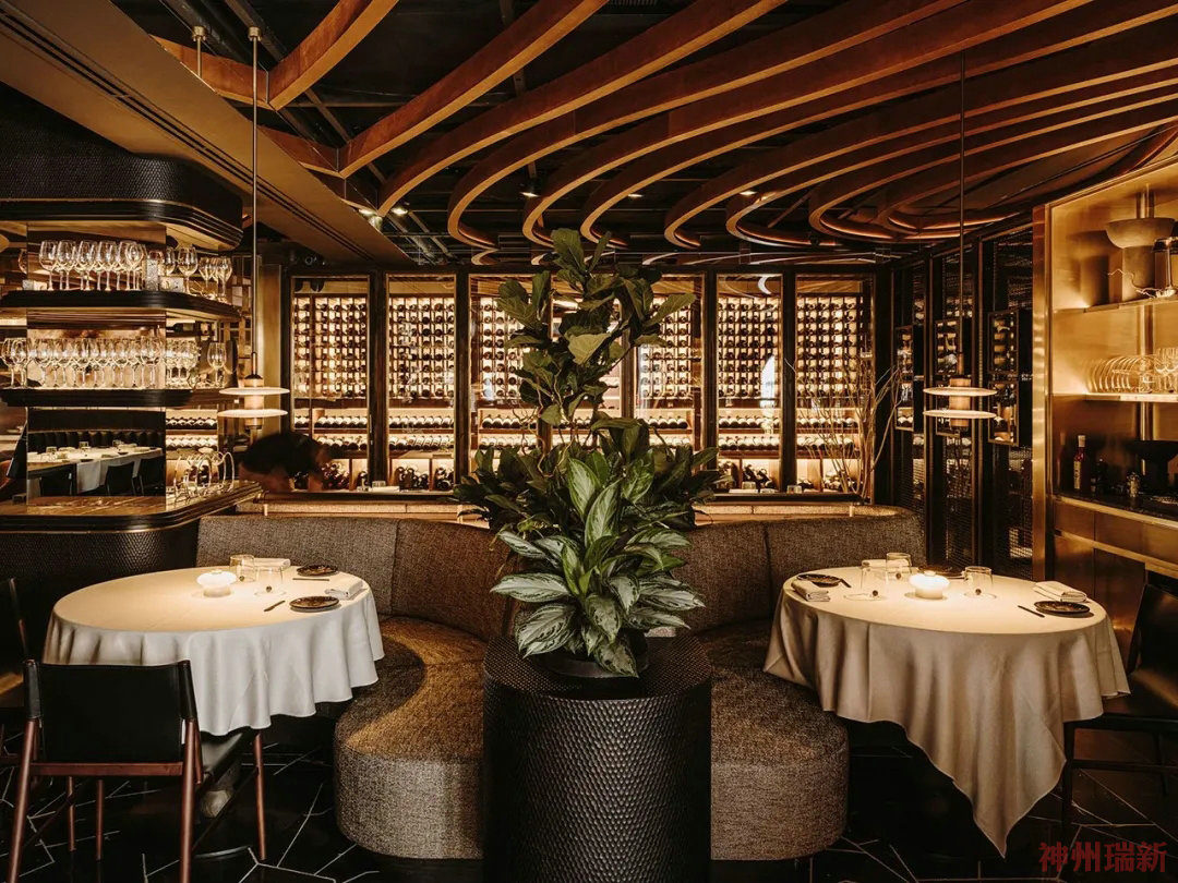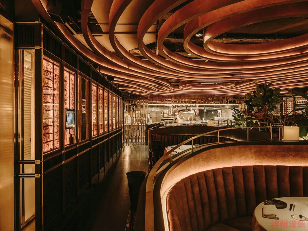 本案是餐飲空間裝修,牛排餐廳裝修設計的其中一個案例,整體設計風格用煙熏和木炭燒烤素材,展現餐廳的木材、石頭和火的原始審美。再經過拋光的巧妙設計,神州瑞新設計師采用原始真實的素材,并以重色和流暢紋理的泥土色調為基礎,使他們想起了在火爐上烹制肉類的原始體驗,而又沒有放棄其現代精致的標志感。