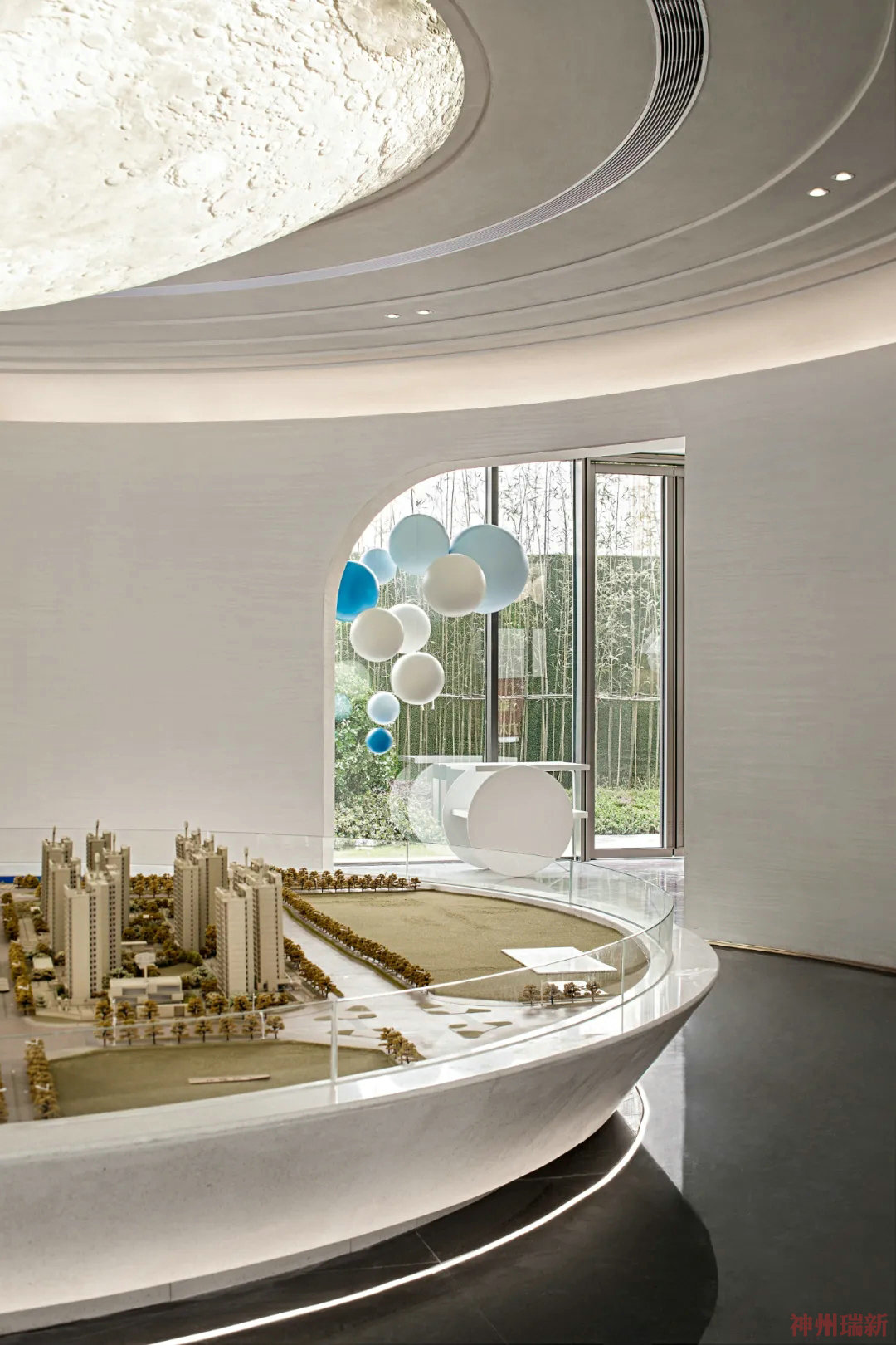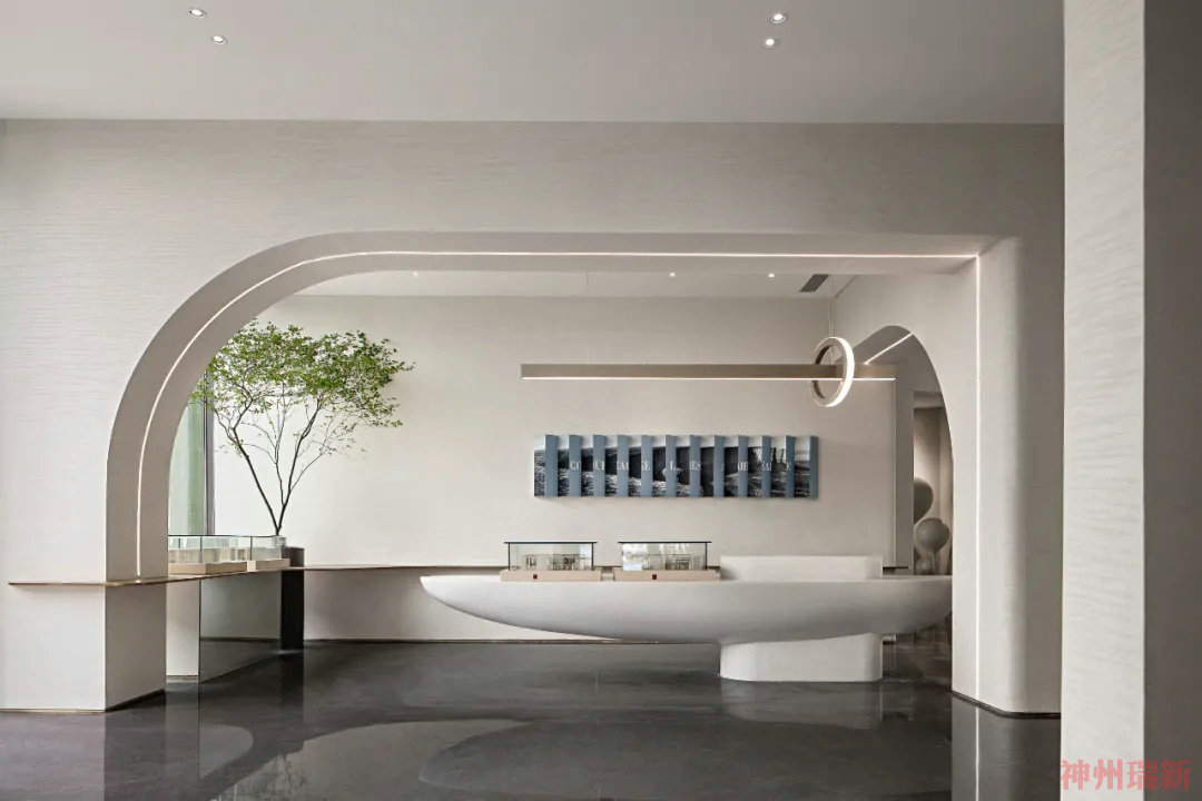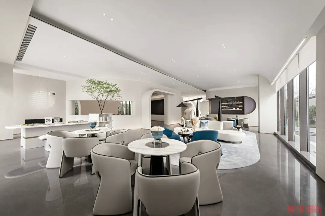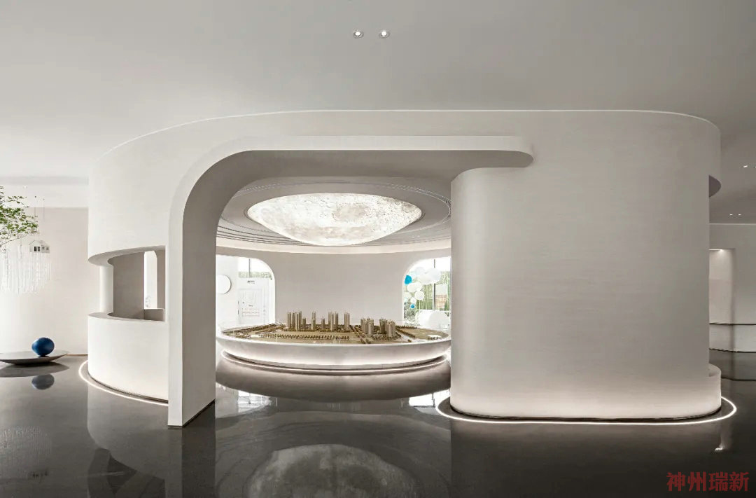 本案是售樓中心裝修設計的簡潔風格的代表,大廳裝修材料的材質剛柔共構,大理石和金屬裝修材料的大量運用,整體干凈、整潔,空間的線條感和流動軌跡顯得順暢,身臨其境,給人以清新大氣之感覺。神州瑞新設計師創新性的將星辰開闊感元素融入到本案中,行走在售樓中心空間中,猶如太空漫步之感。