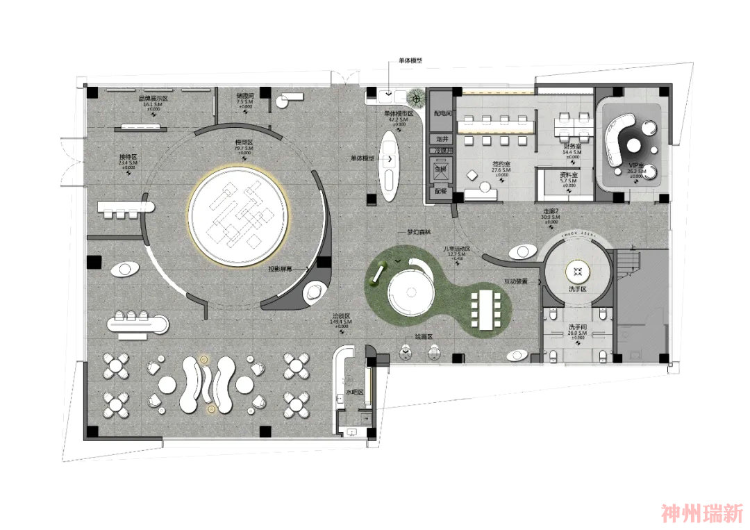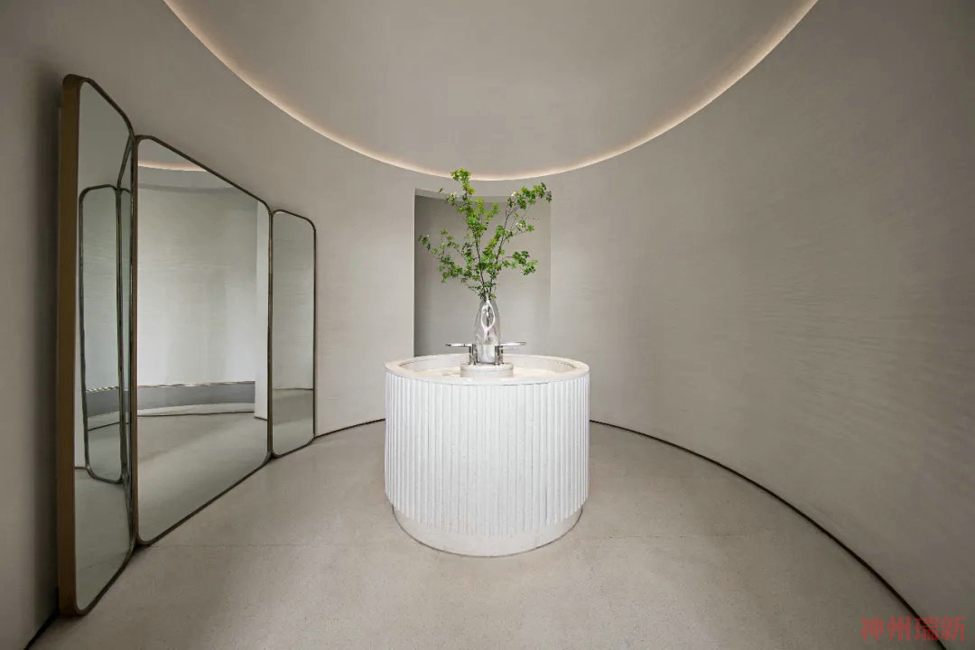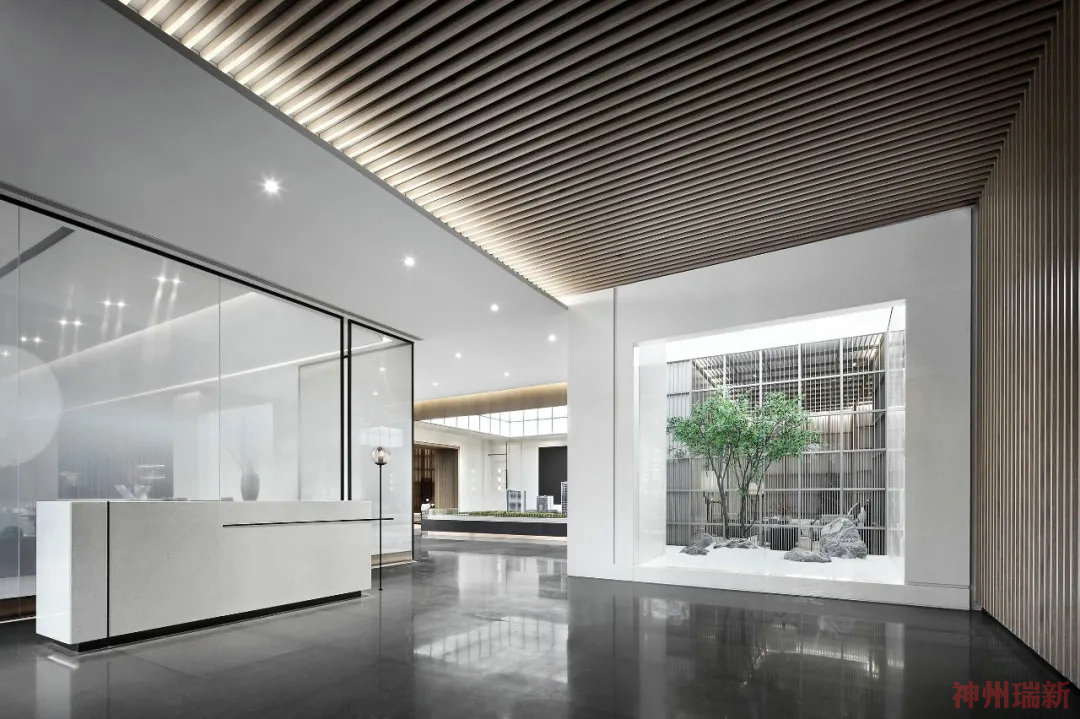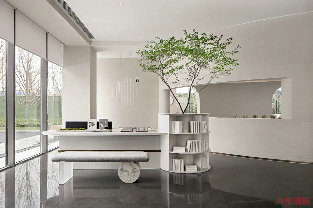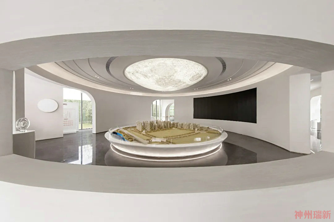 本案是售樓中心裝修設計的簡潔風格的代表,大廳裝修材料的材質剛柔共構,大理石和金屬裝修材料的大量運用,整體干凈、整潔,空間的線條感和流動軌跡顯得順暢,身臨其境,給人以清新大氣之感覺。神州瑞新設計師創新性的將星辰開闊感元素融入到本案中,行走在售樓中心空間中,猶如太空漫步之感。