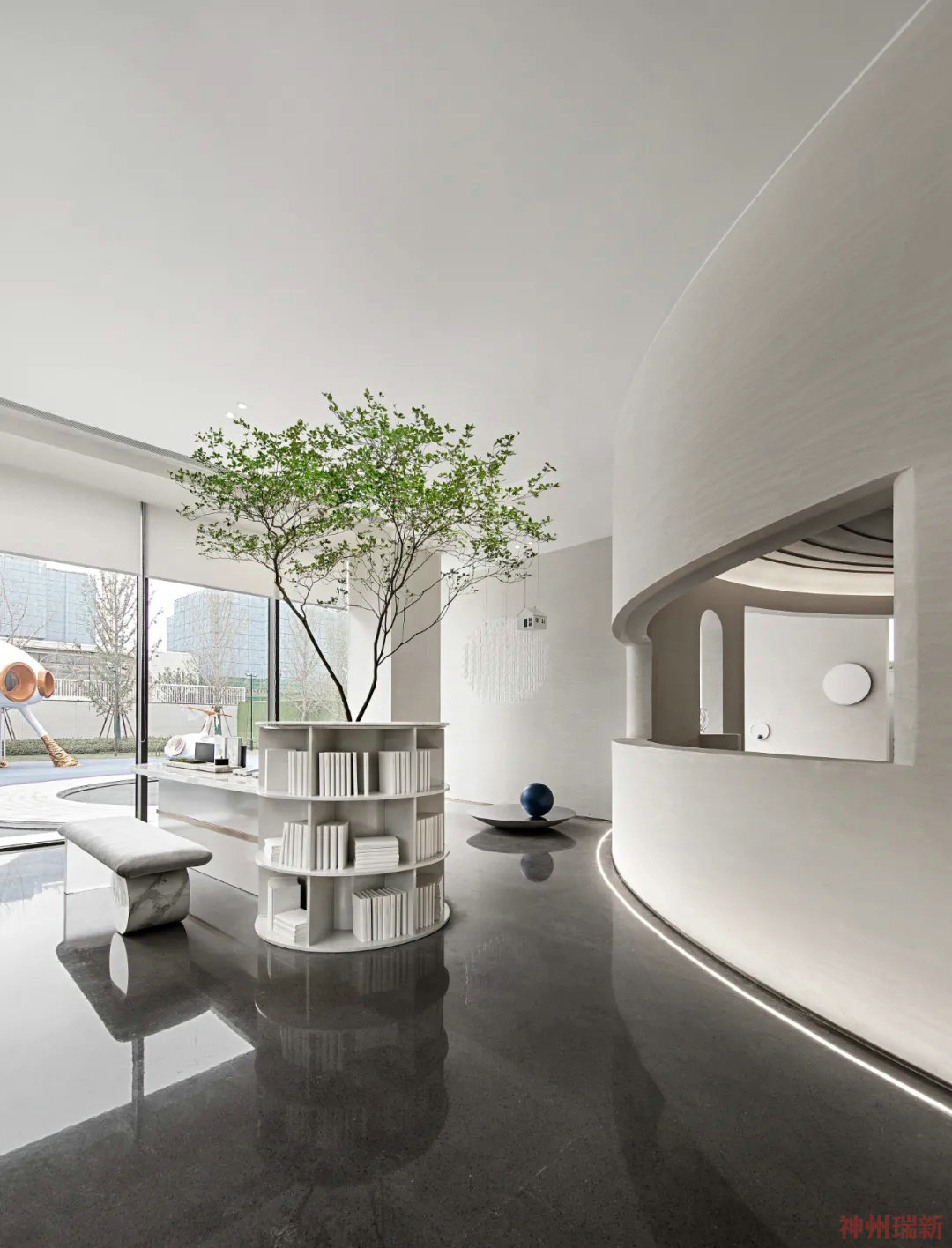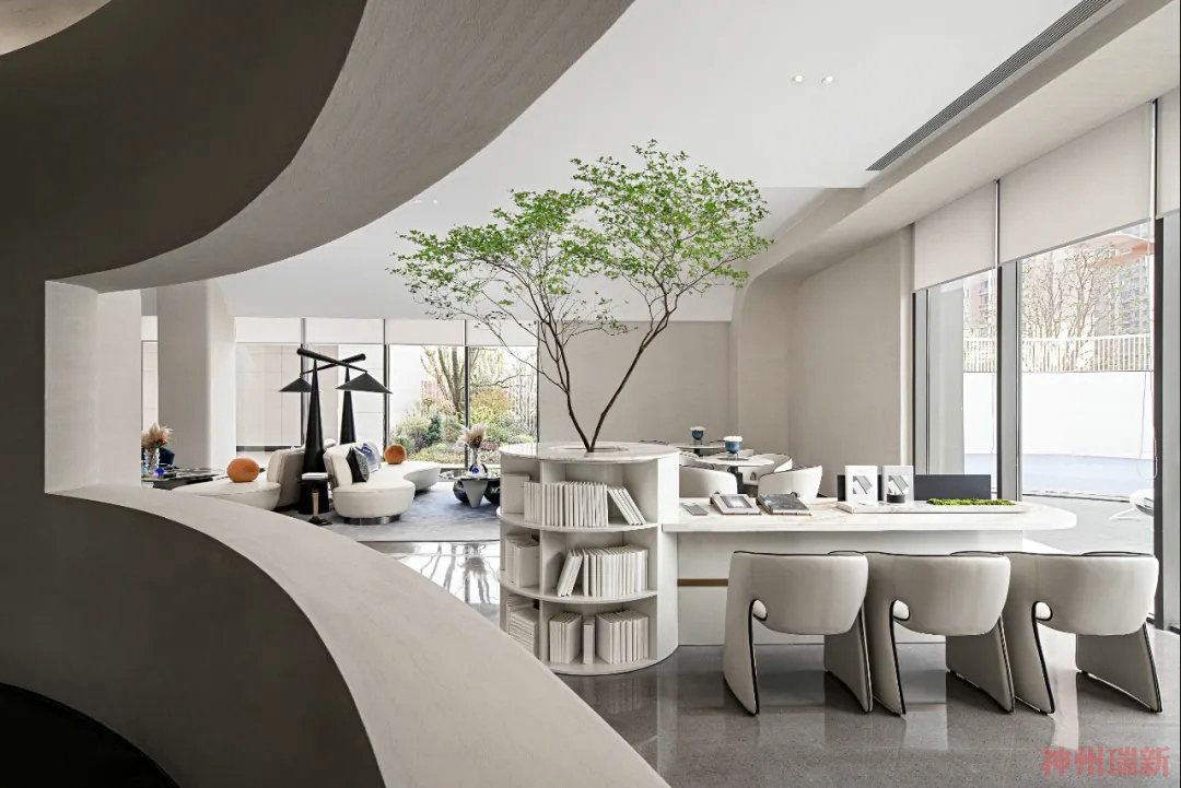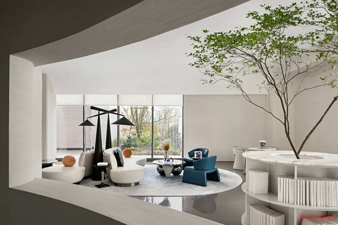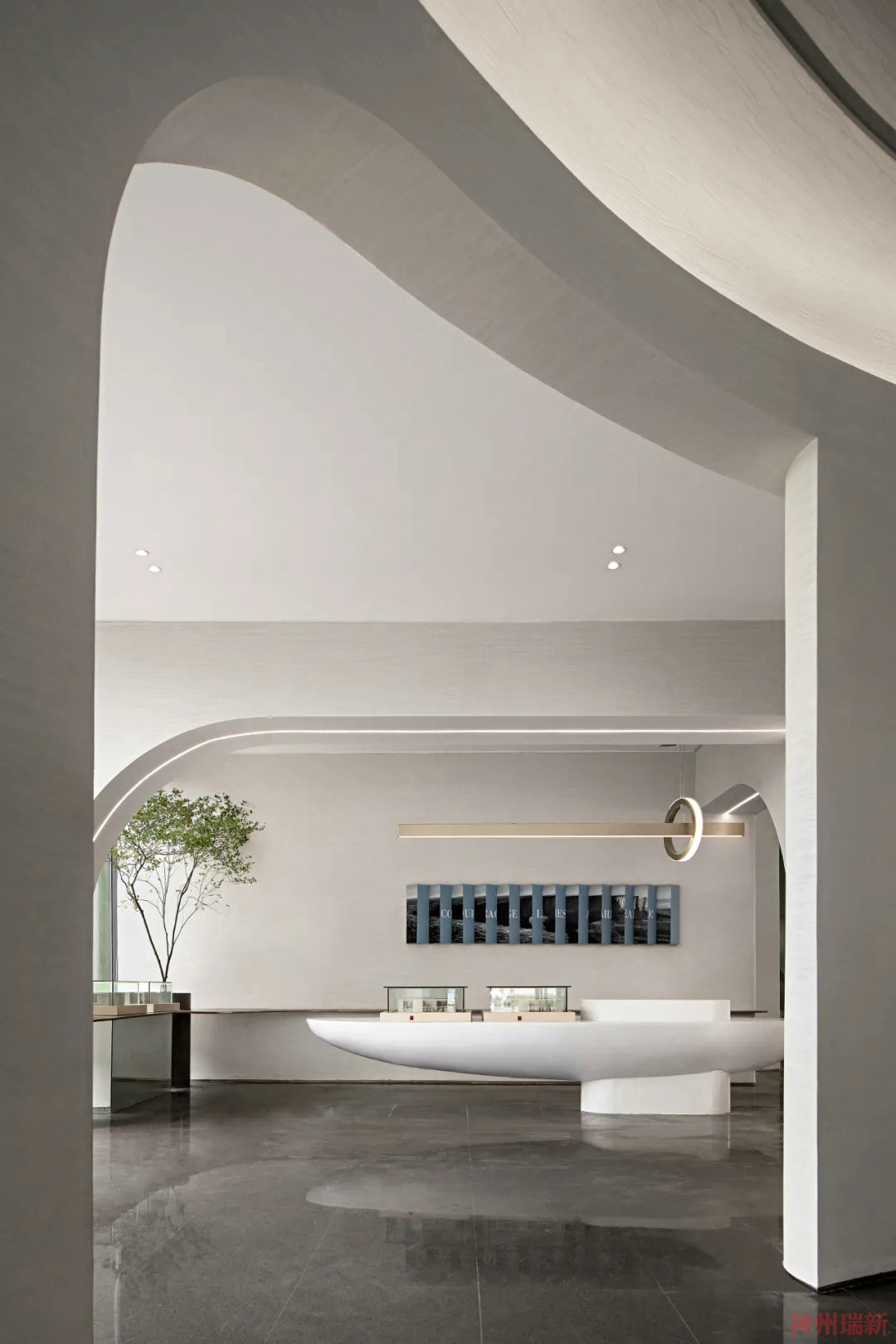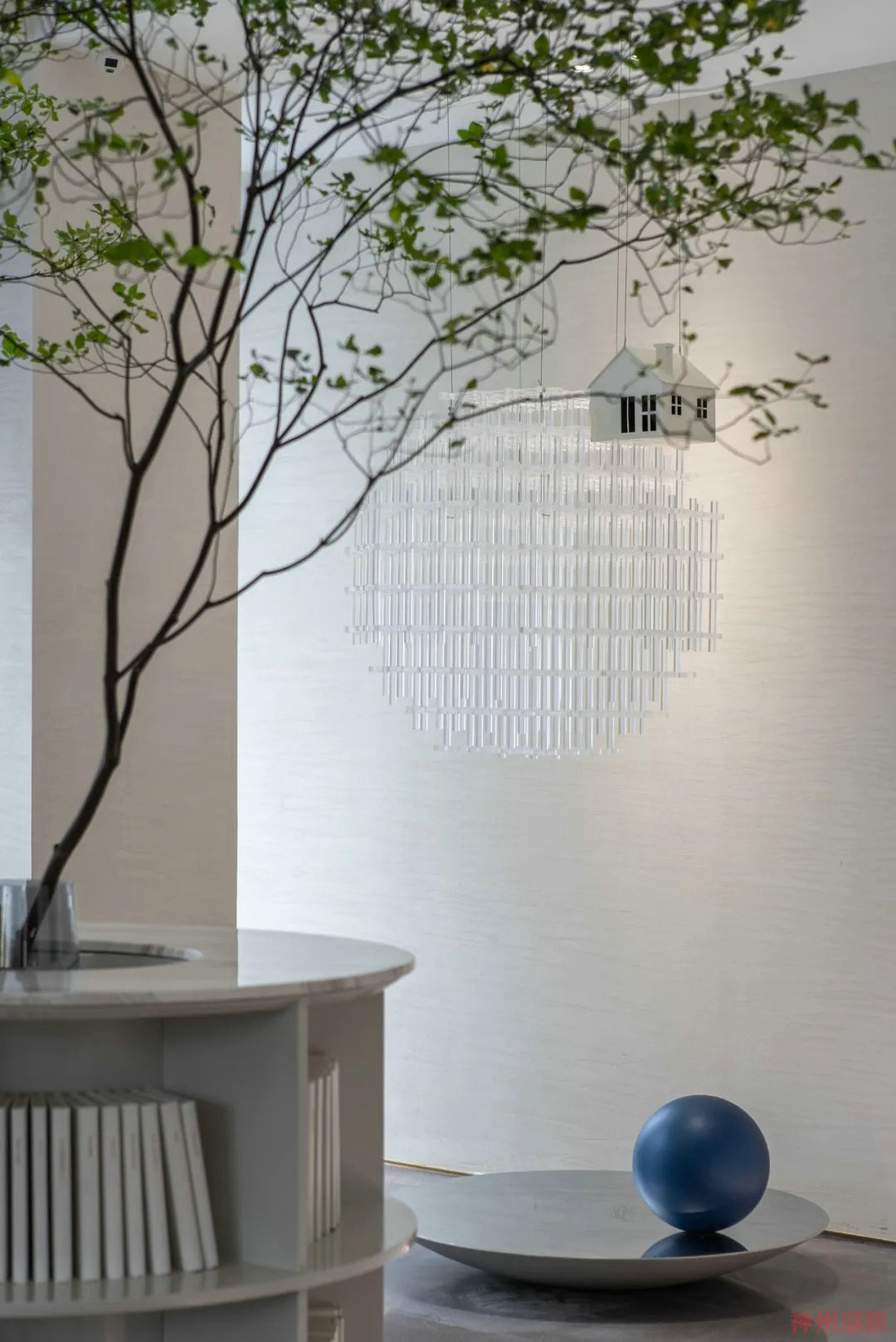 售樓中心空間內部線條的流暢,行云流水,對稱和不對稱的犬牙交錯,動感活潑的韻律美悄然而生,空間中擺放了各種充滿想象的藝術品精準定位的陳設,消除了商業空間的商業氣息,變得生動文藝。