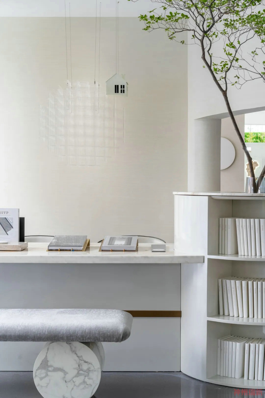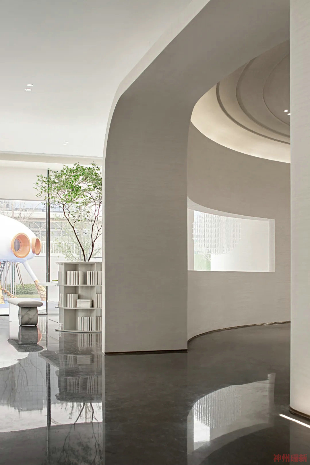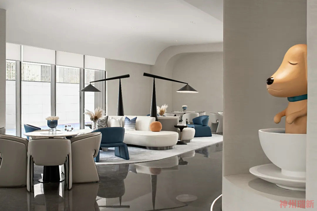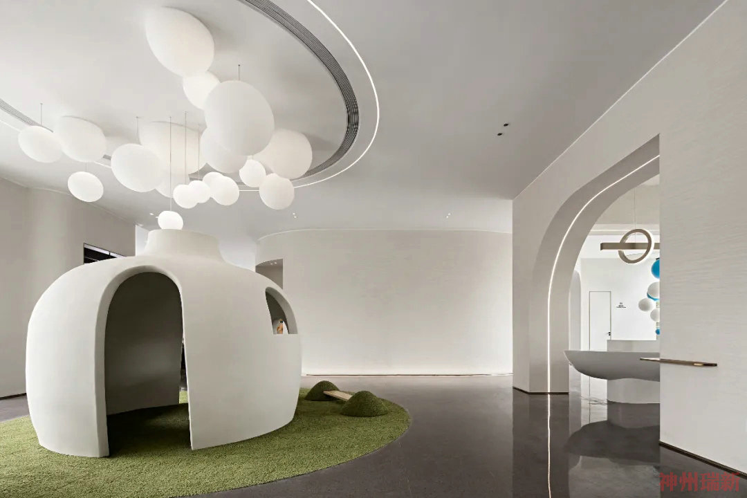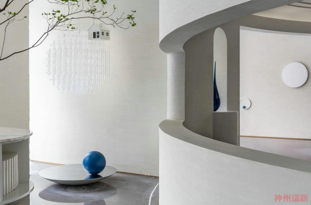 售樓中心空間內部線條的流暢,行云流水,對稱和不對稱的犬牙交錯,動感活潑的韻律美悄然而生,空間中擺放了各種充滿想象的藝術品精準定位的陳設,消除了商業空間的商業氣息,變得生動文藝。