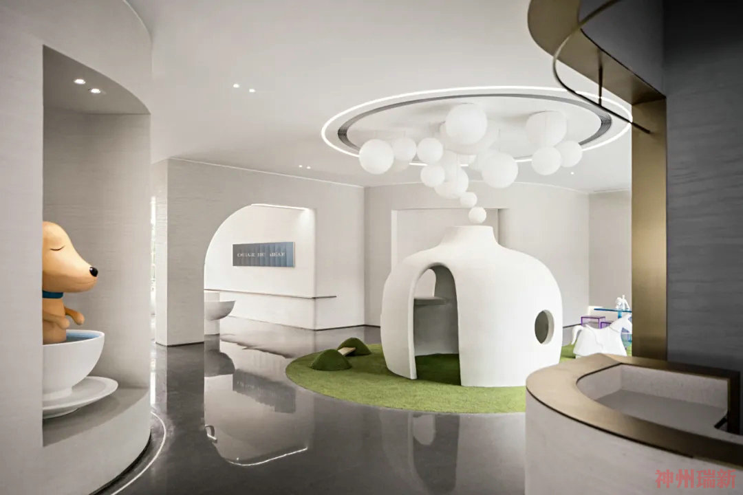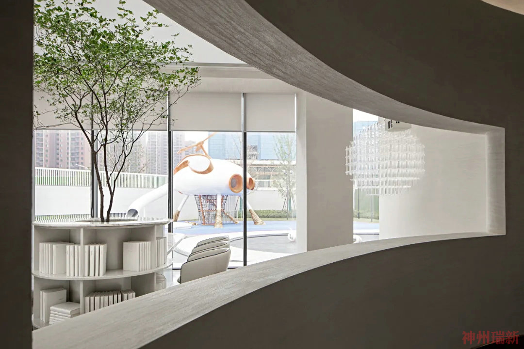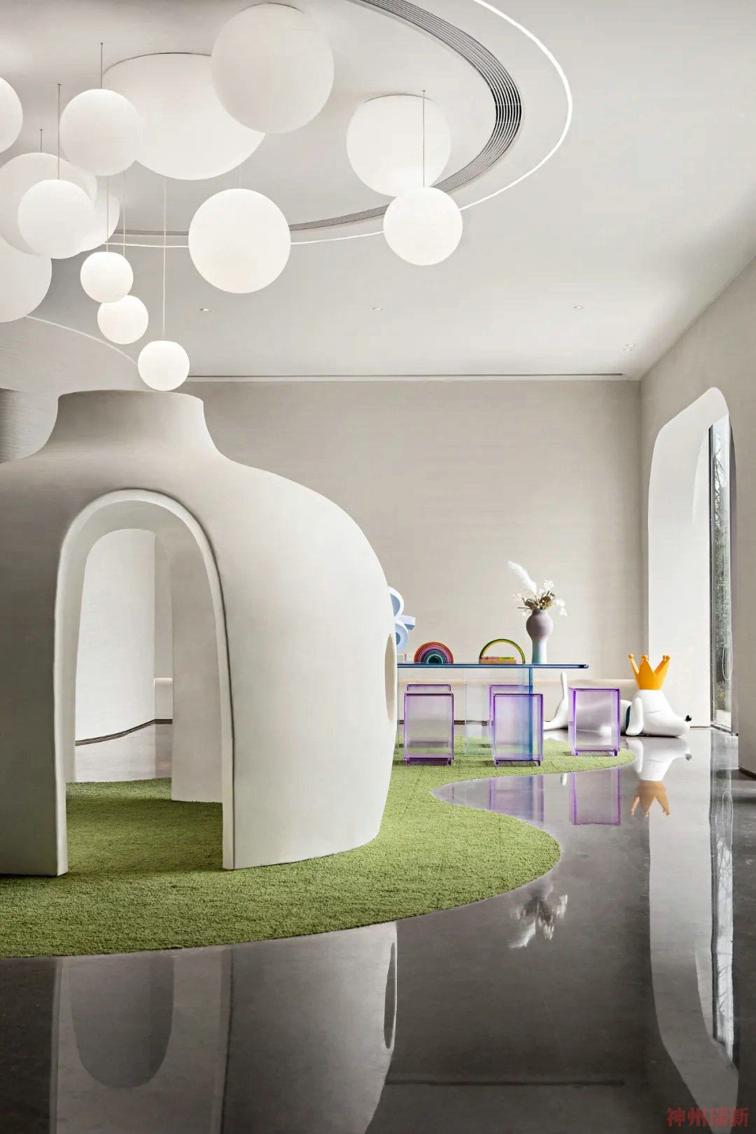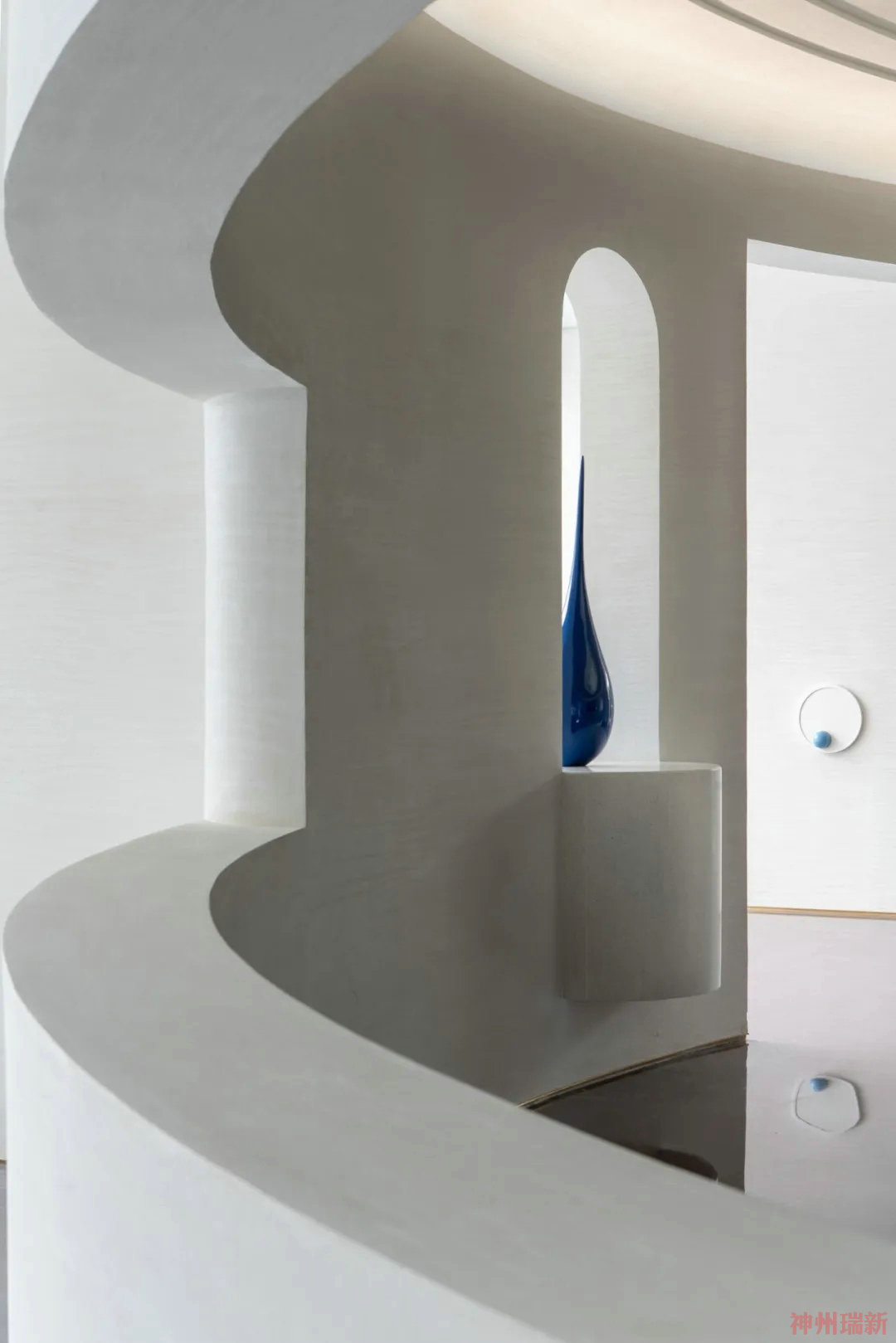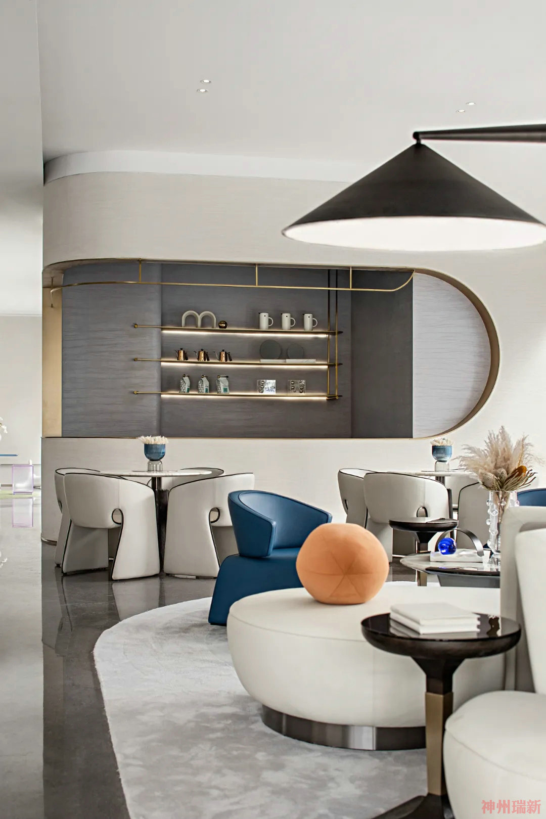 售樓中心空間內部線條的流暢,行云流水,對稱和不對稱的犬牙交錯,動感活潑的韻律美悄然而生,空間中擺放了各種充滿想象的藝術品精準定位的陳設,消除了商業空間的商業氣息,變得生動文藝。