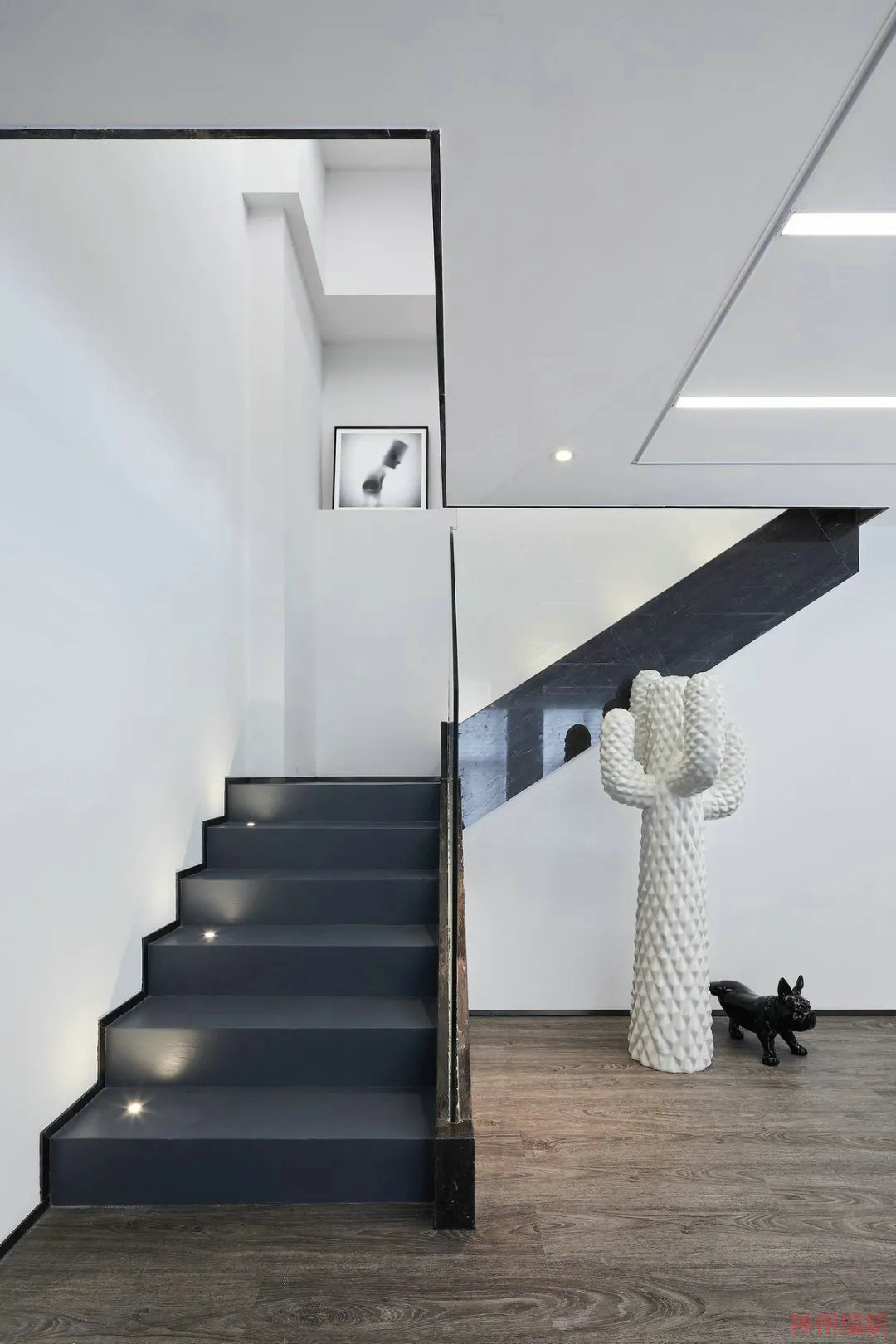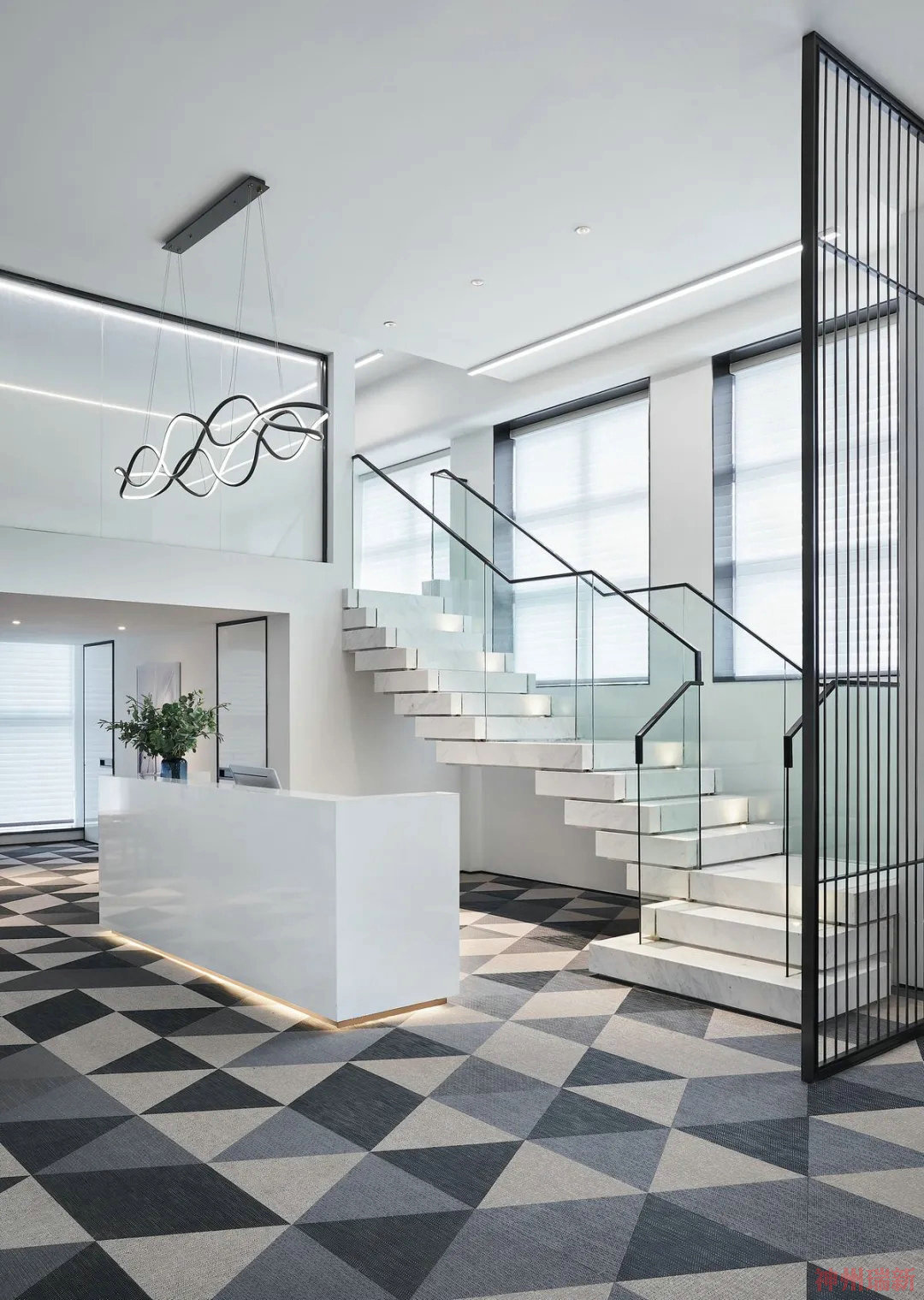 辦公空間各個功能性區域在色彩和線條上視覺富有層次感,具有自然和時尚的元素展現,頂部處理上,頂部造型和色調的裝修設計效果,在辦公室照明燈光的映襯下,干凈整齊,律動感很強,辦公家具上特體現了時尚和藝術的美感、布局合理,開放式辦公室裝修風格,使辦公區域的格局體現了出來,包容開放的企業精神,黑白色的樓梯階與上面的燈光相得益彰,整體的軟裝裝飾,盡顯人文藝術的美感,會議室和辦公室主題風格是簡潔潮流,辦公室裝修設計細節上處理的都具備質感,整體效果的細節質感和色彩美學,把國際化的辦公空間裝飾的淋漓盡致。