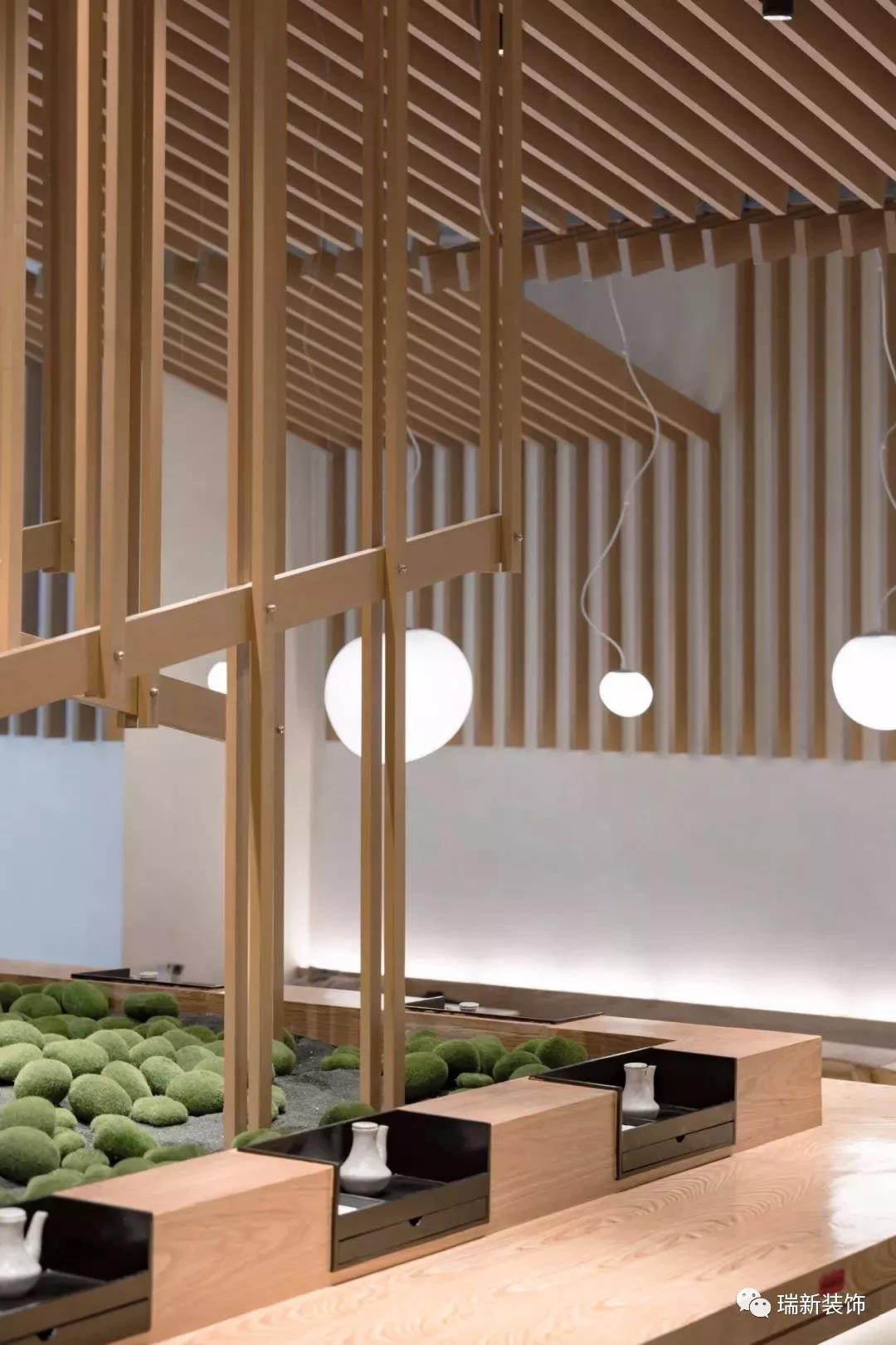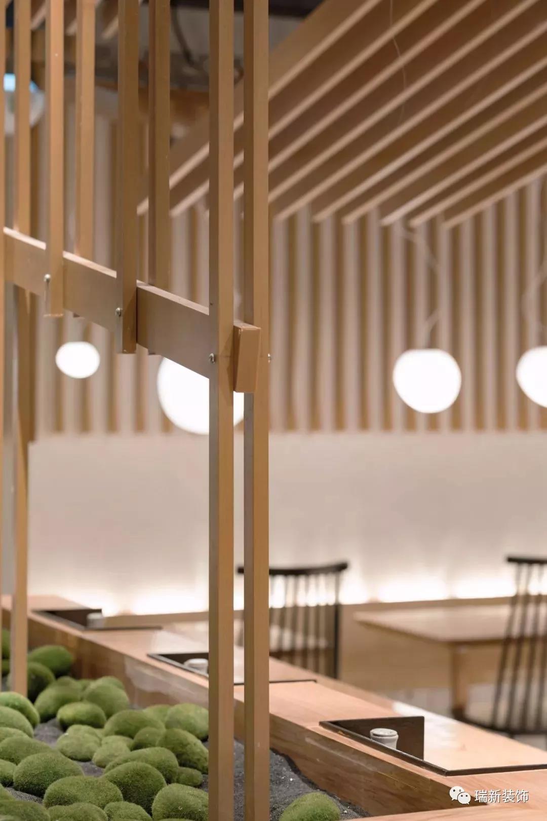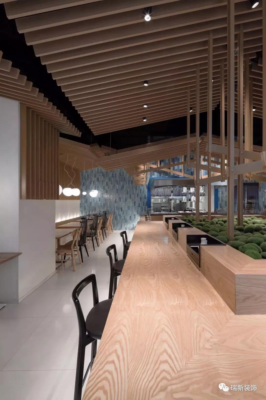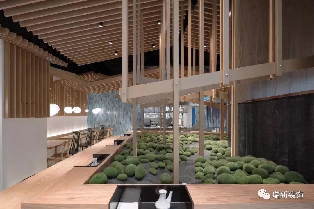 店內大量的木格柵、木色與白色的使用,中央的環形就餐臺,用苔蘚與石塊營造出千山萬壑的枯山水微景觀。這個區域之中不僅將空間的關系帶來的生動的點綴,也讓人與食物,與空間的發生了更多情感的互動。綠景與藍色的背景墻,生出一種雨過之后遠岱天青的感受,整個空間即刻生動透氣起來。