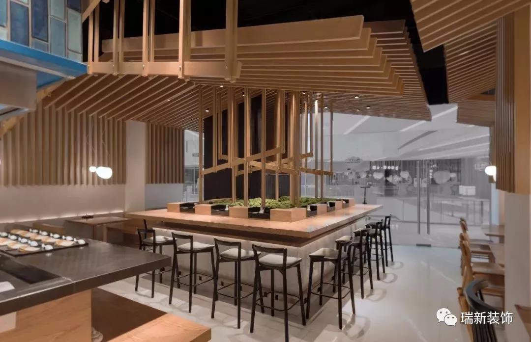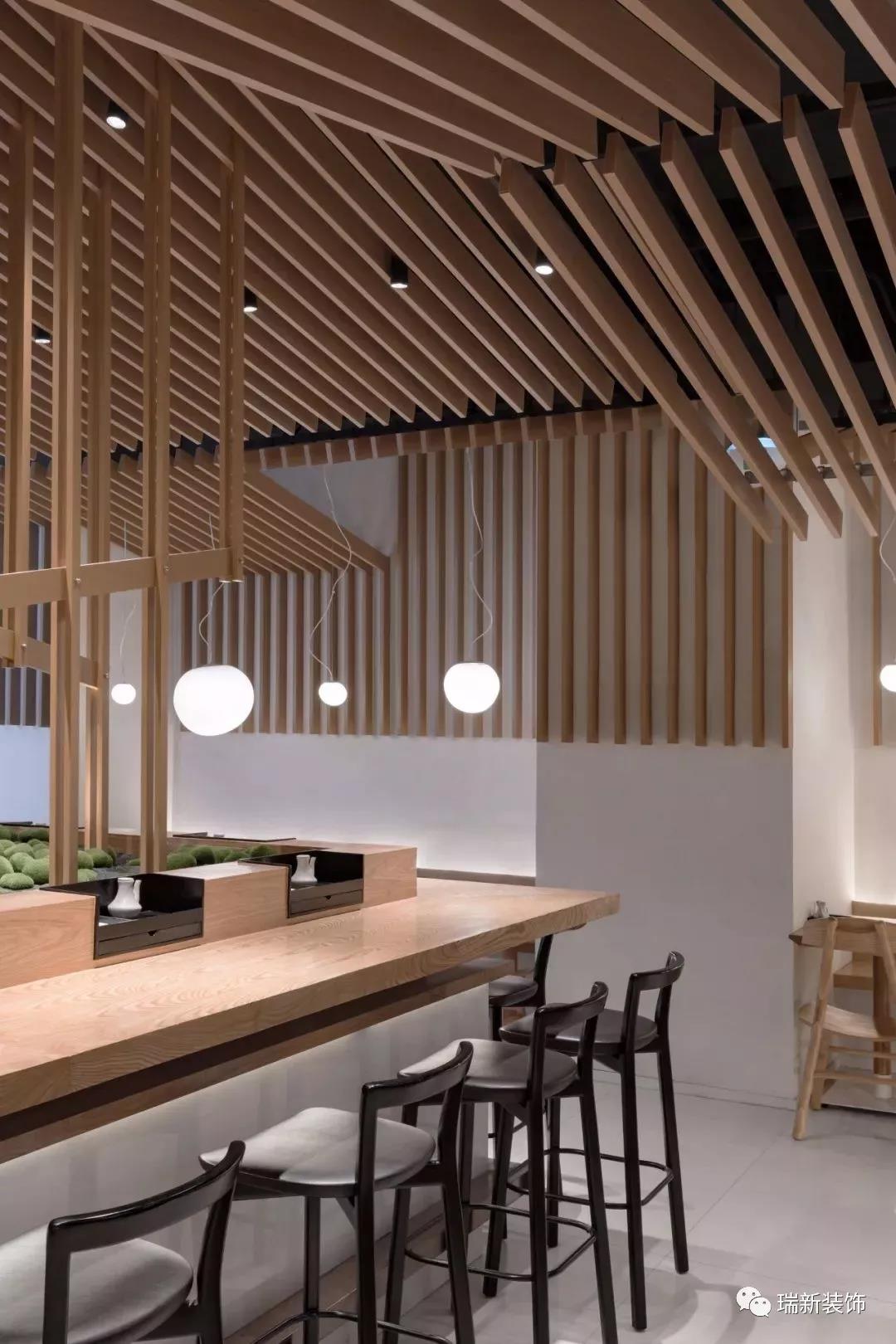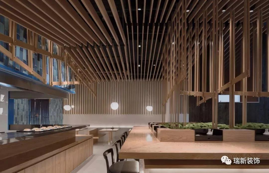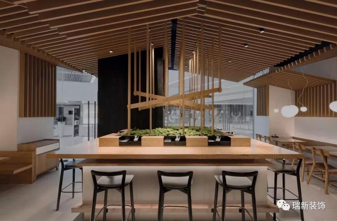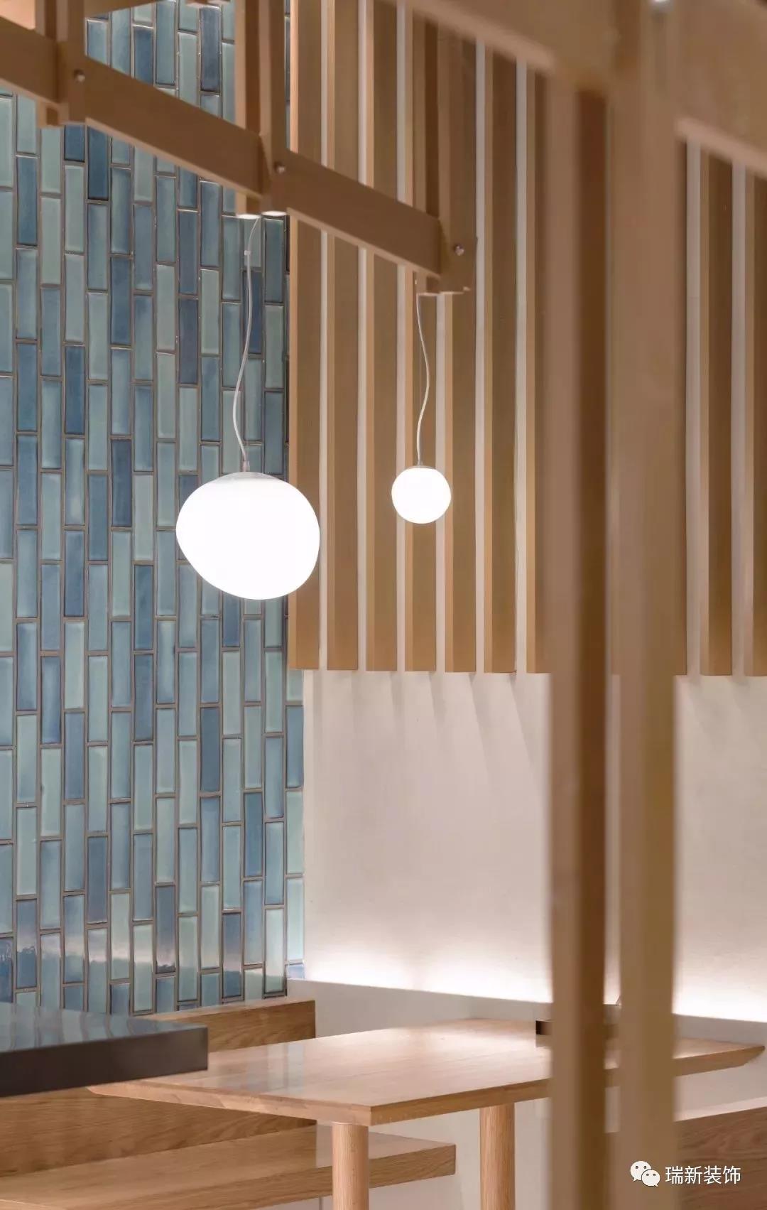 店內大量的木格柵、木色與白色的使用,中央的環形就餐臺,用苔蘚與石塊營造出千山萬壑的枯山水微景觀。這個區域之中不僅將空間的關系帶來的生動的點綴,也讓人與食物,與空間的發生了更多情感的互動。綠景與藍色的背景墻,生出一種雨過之后遠岱天青的感受,整個空間即刻生動透氣起來。