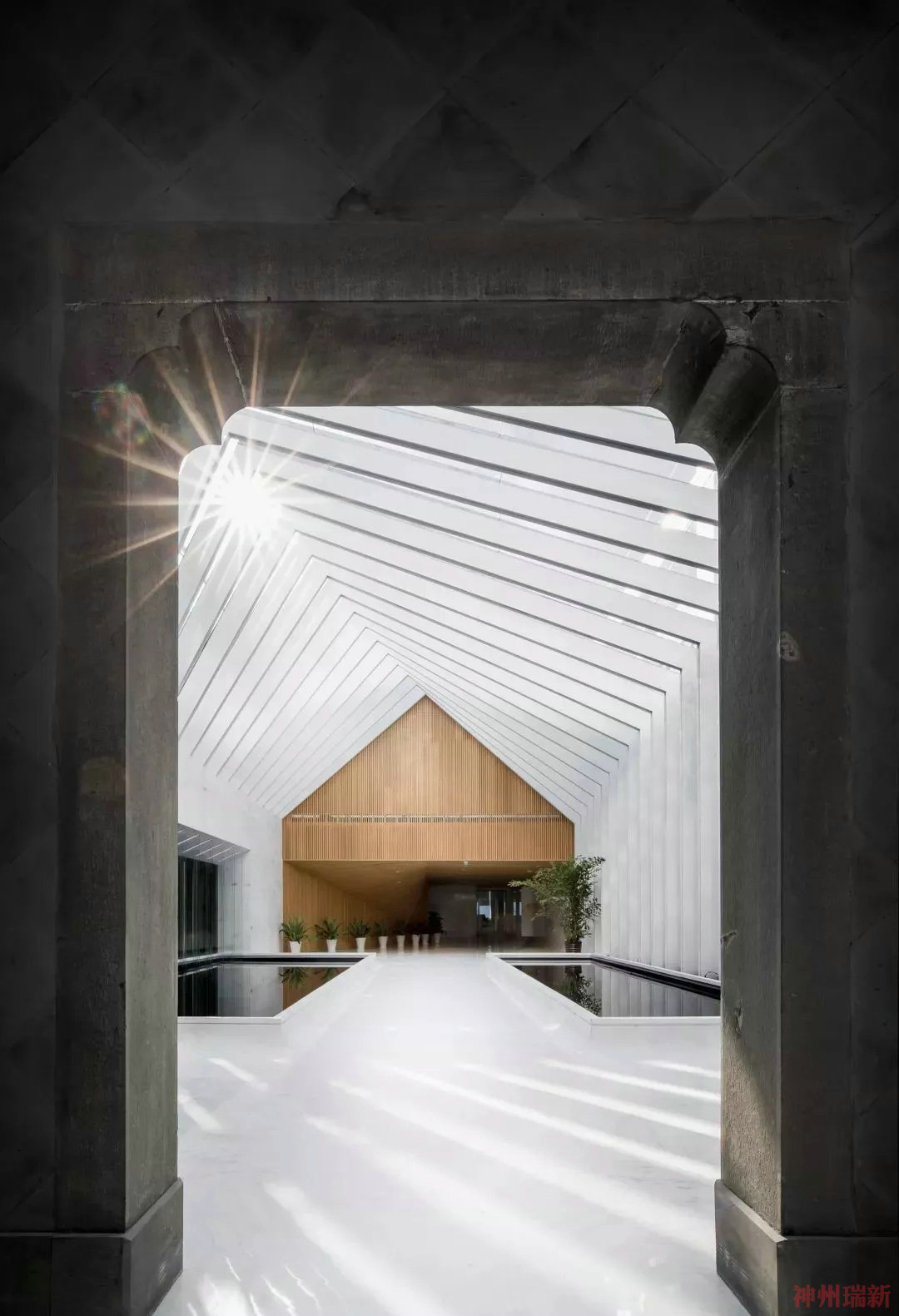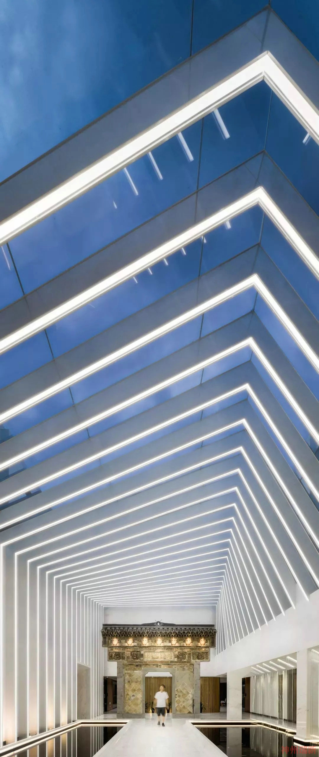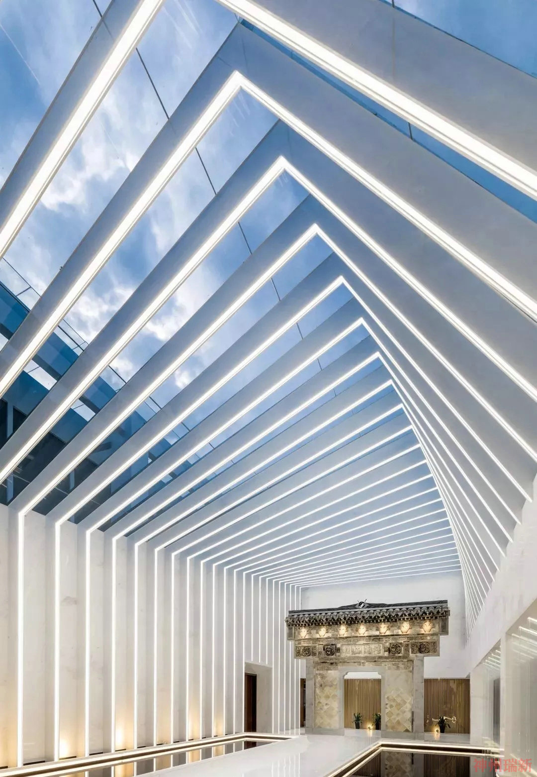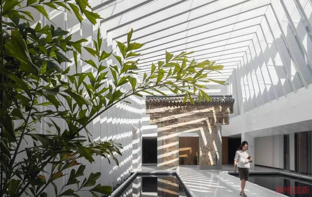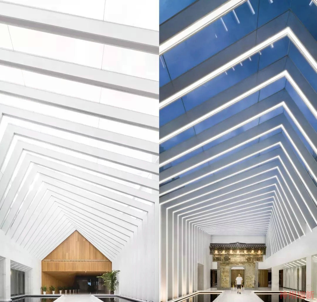 為了有效的減少新增體量和避免外觀上景觀的阻礙,采用較為自由的空間包裹形態,由三角形向四邊形變化的扭轉體量,也因扭轉的形體帶動了空間的流動性與律動感。自然光透過百葉天幕灑下的斑駁光影與富有科技感的現代室內空間包裹著老牌樓,連接了過去與現在,有如時光隧道。在空間營造的手法上設計師使用的是東方建筑造園傳統,在面對具體問題時又能不拘泥于傳統表達,也可以是和而不同的彼此存在。