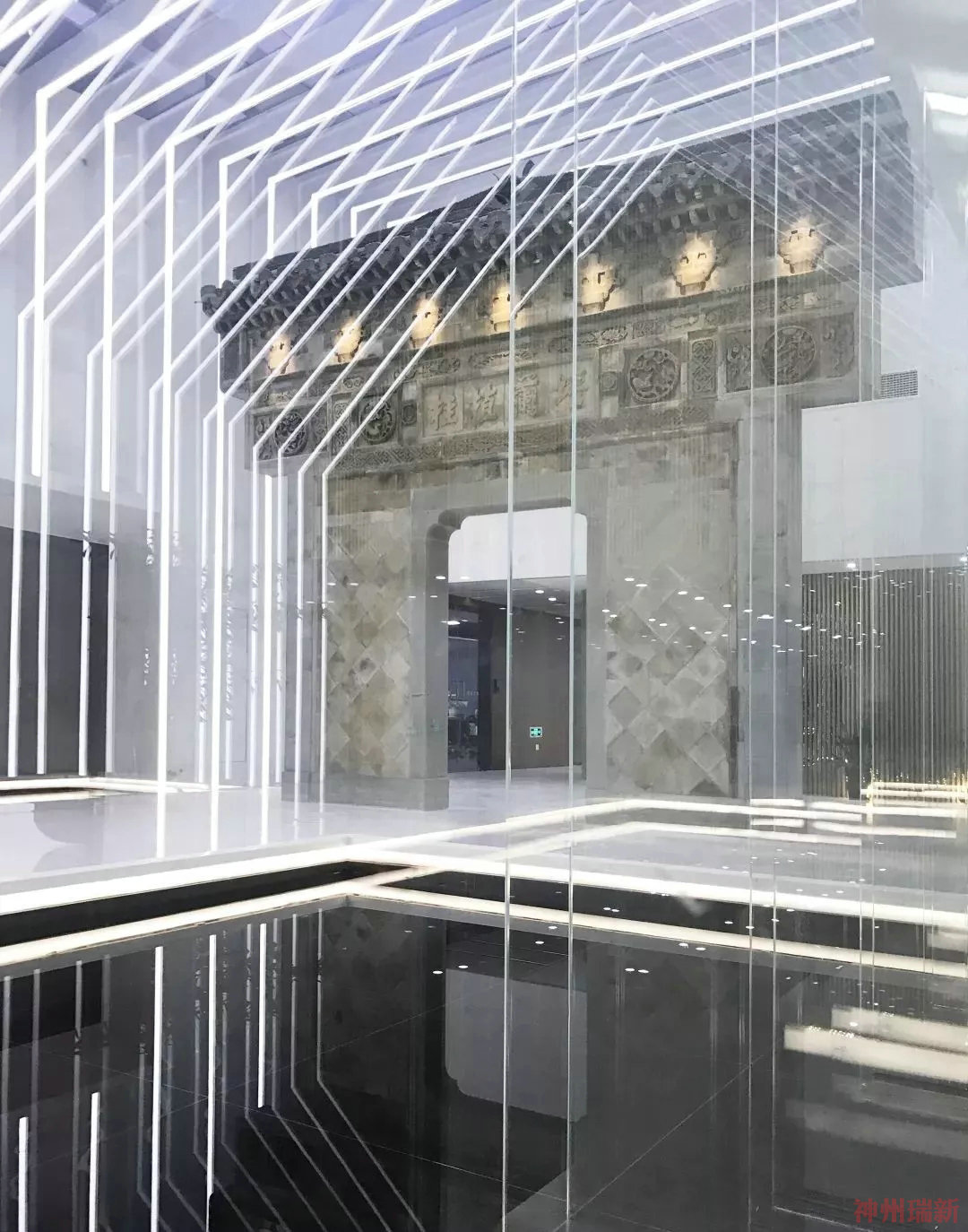 本案是大型辦公室裝修,辦公樓室內面積約2300平方米,是一個集合商務辦公及接待會所的空間改造設計。神州瑞新設計師希望能夠將當地的歷史牌樓放置于空間的中心作為對傳統文脈的尊重,同時展示出作為現代科技公司不忘傳統,繼往開來,辦公室主體中庭空間的  設計也環繞著此歷史牌樓延伸展開。在辦公空間的中心設置采光中庭,引入自然光線;而歷史牌樓將成為這個全新空間中最重要的展覽裝置,在這里新與舊,傳統與未來形成了充滿張力的對話關系。