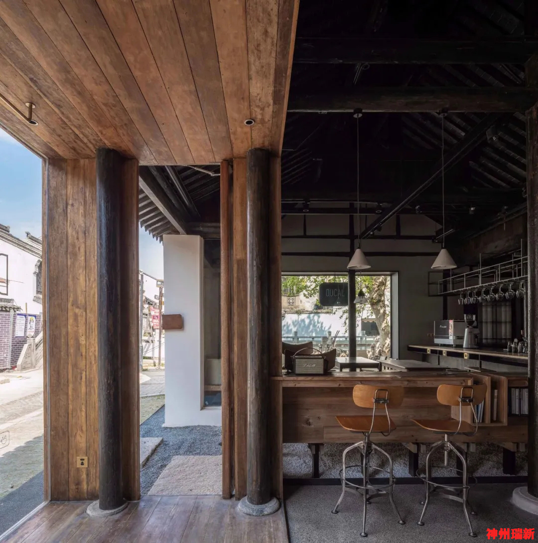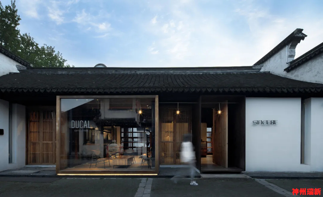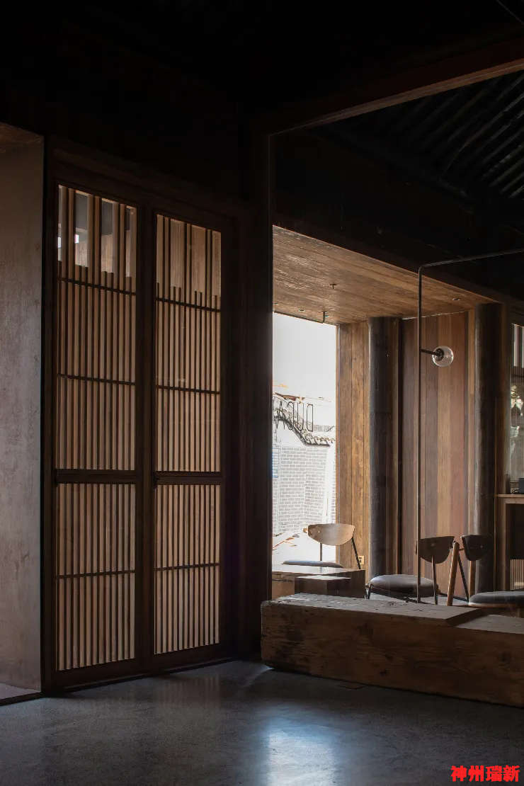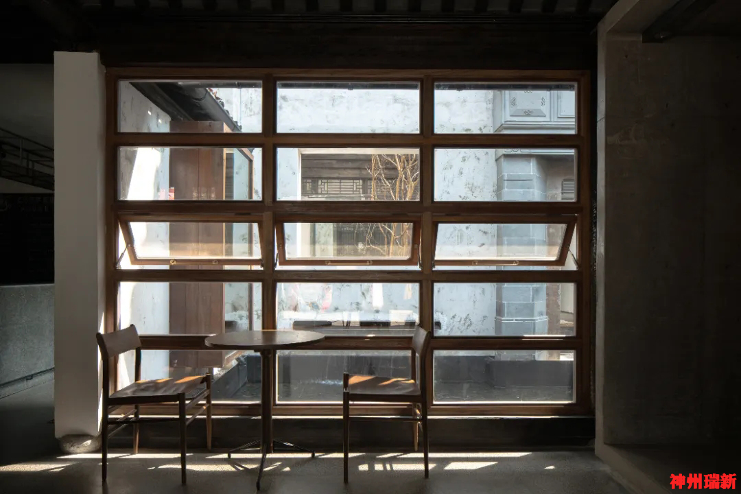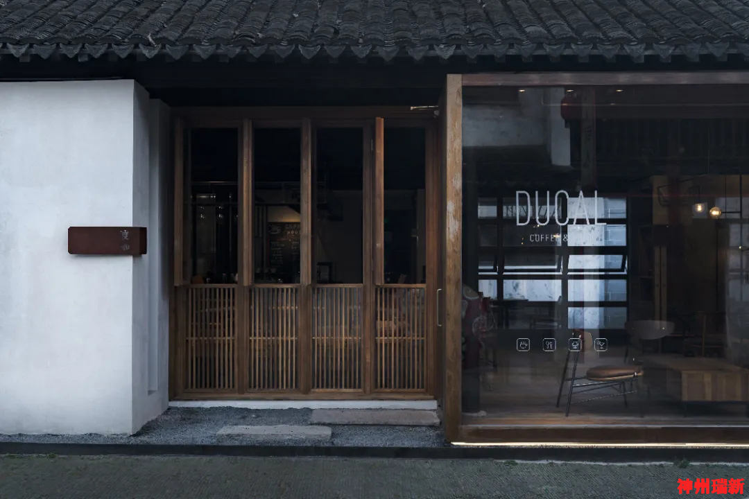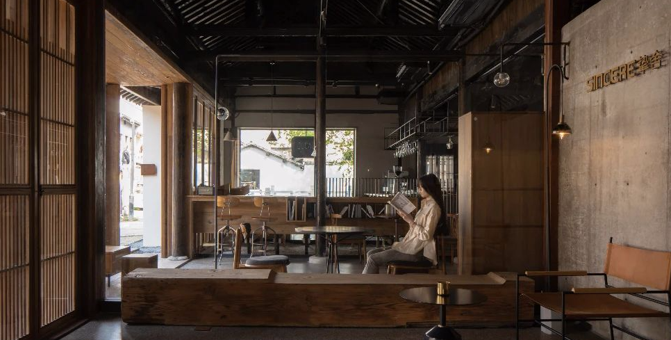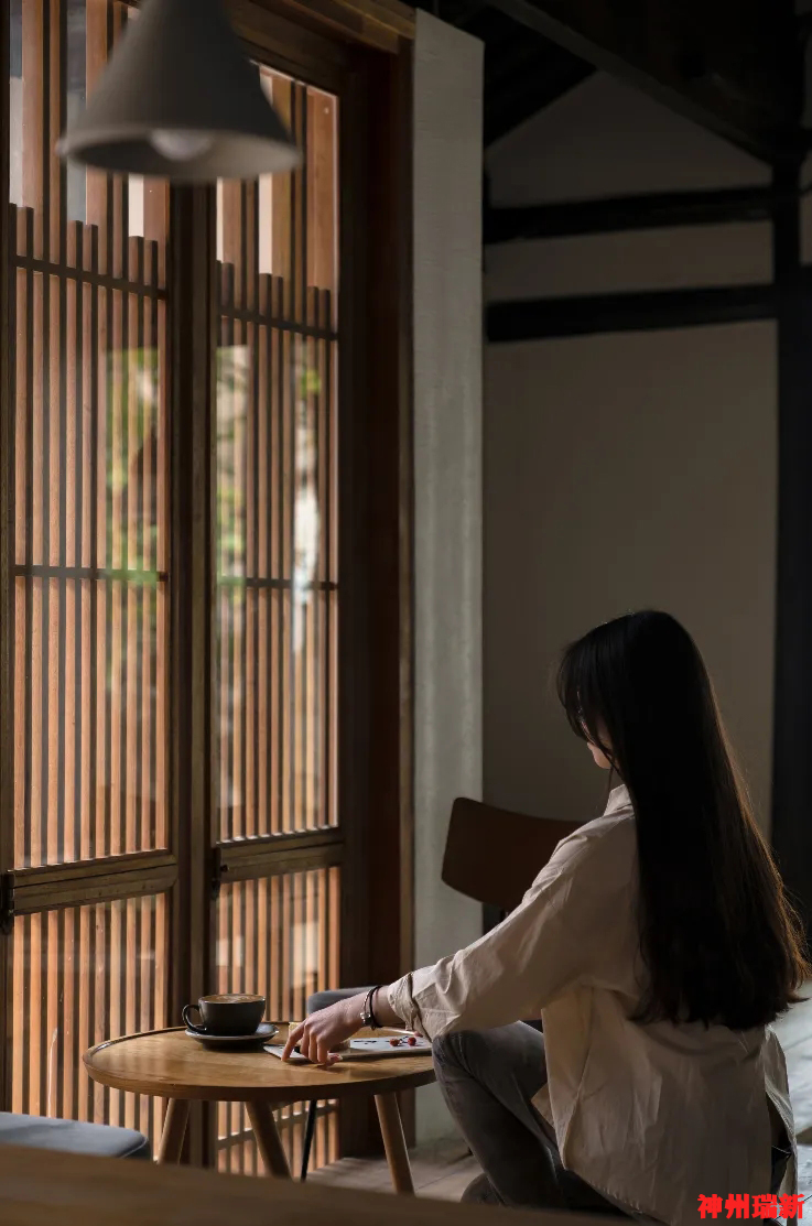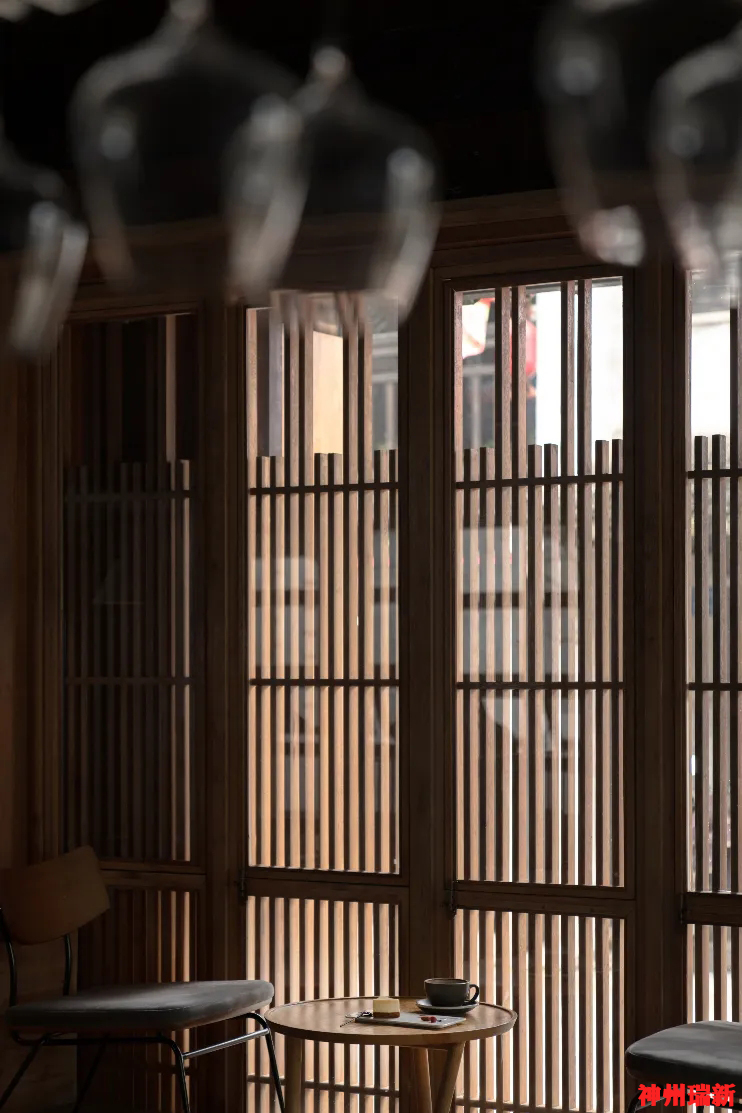 更新后的入口處,細木格柵窗替代了原有的密閉花格窗,更加輕簡有溫度;外凸原木落地玻璃窗的運用讓室內外空間更加敞亮通透。咖啡廳側面開辟出進入室內的通道,褐色砂石中青石板路曲折迂回,營造出溫婉江南的意境。