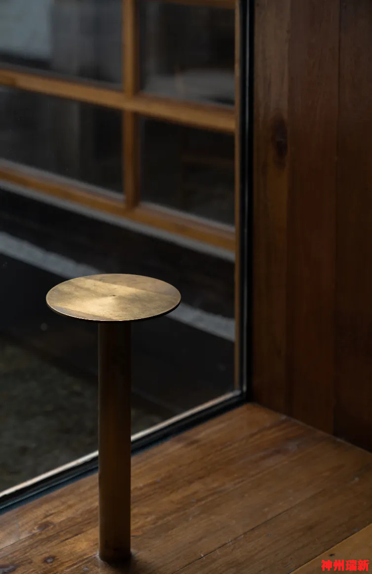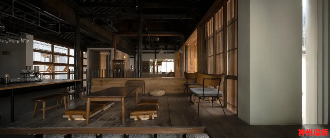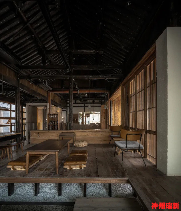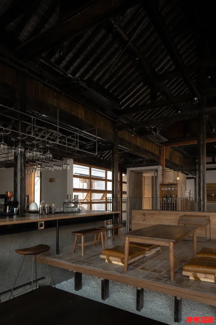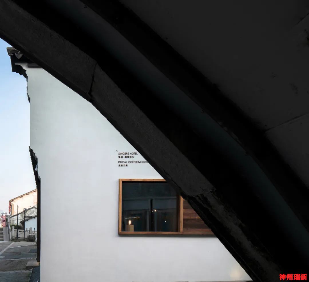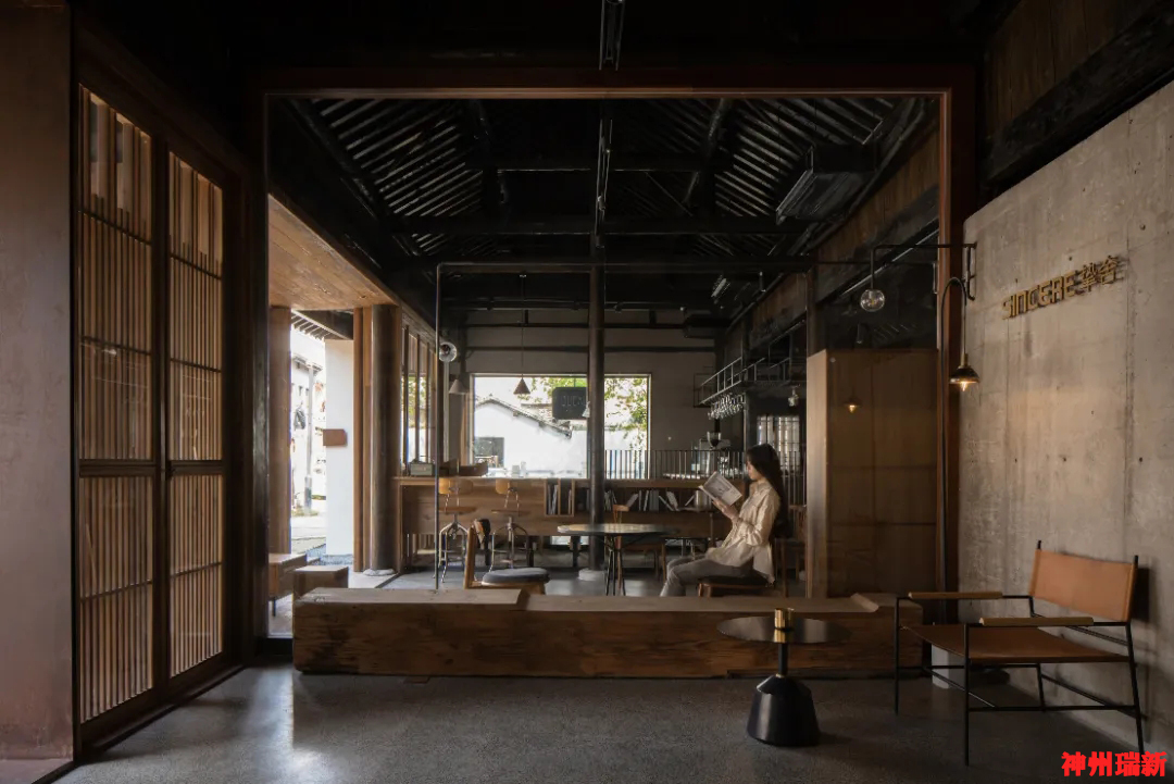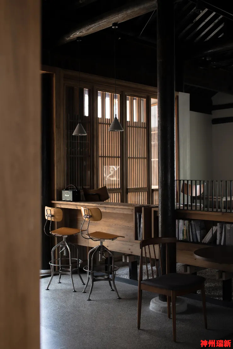 更新后的入口處,細木格柵窗替代了原有的密閉花格窗,更加輕簡有溫度;外凸原木落地玻璃窗的運用讓室內外空間更加敞亮通透。咖啡廳側面開辟出進入室內的通道,褐色砂石中青石板路曲折迂回,營造出溫婉江南的意境。