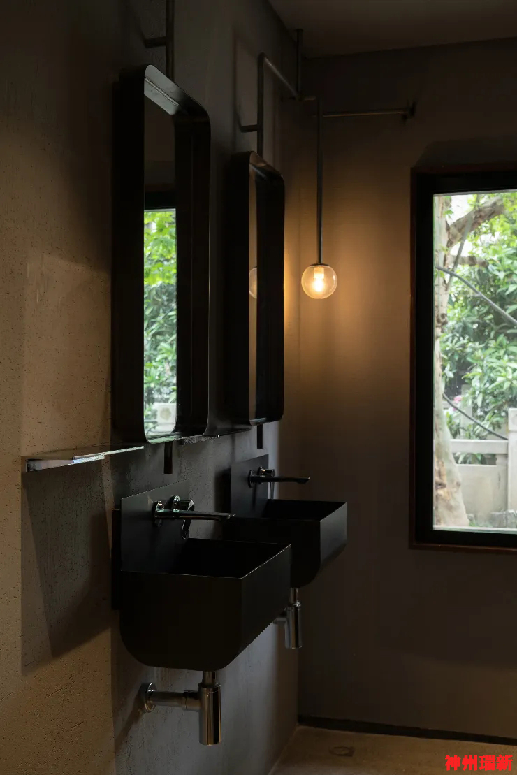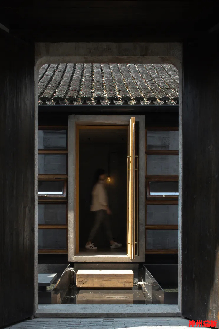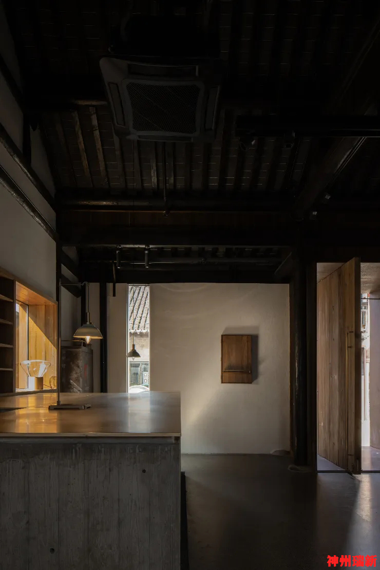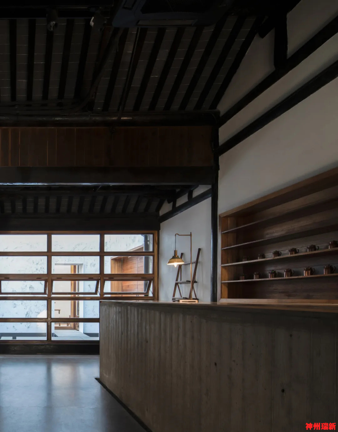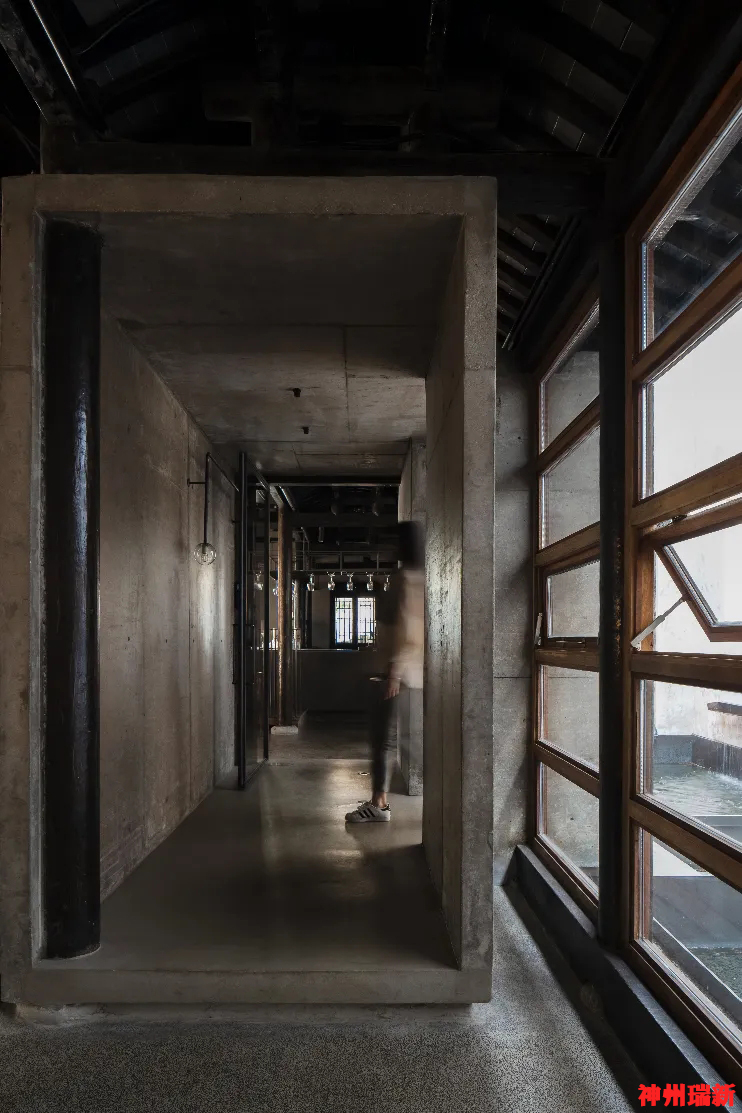 藝術空間和咖啡區的交接處,有一個狹長的新澆混凝土通道,內外切換給人強烈的“穿越”感。下沉式的江南庭院風雅別致,置身其中,偷得浮生半日閑。