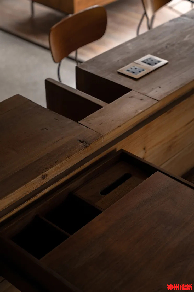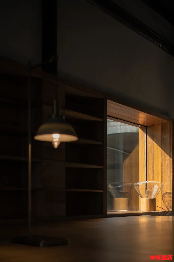 用餐區中央整體被抬高,形成頗具日式風格的榻榻米區,帶有多格書架的實木吧臺、水吧及下沉式休閑區域,讓室內空間錯落有致,形成一個有趣的視覺體系。鄰窗水流聲不絕于耳,樹影婆娑,內院景色一覽無余。