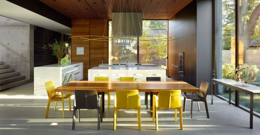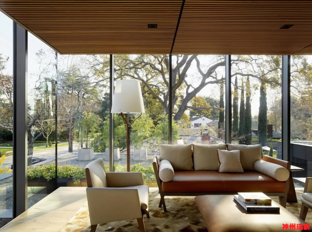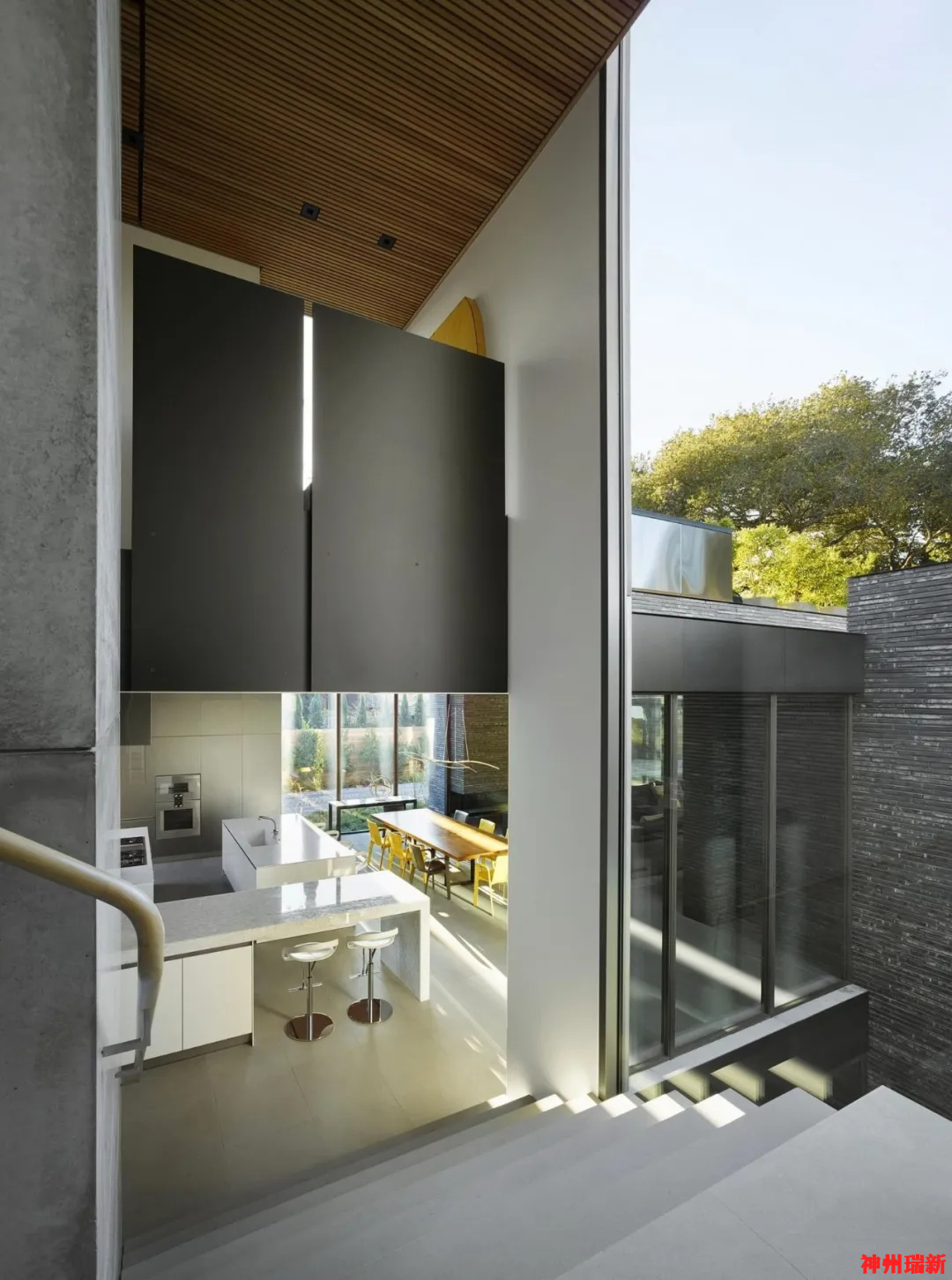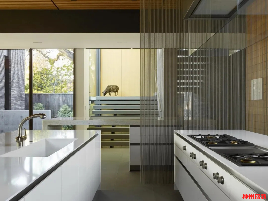 室內的設計同樣選擇了有趣或定制的材料,包括定制的皮門,青銅配件和分隔廚房的鋼網。