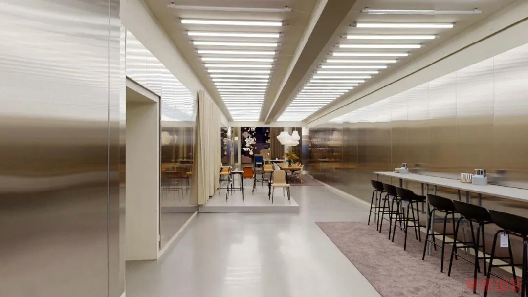 連接入口和室內空間的metal-cad走廊為即將到來的公司流行設計特別展覽提供了溫暖,該設計靈感來自丹麥概念hygge,意思是家常的舒適。展出的是名為Hyg家具系列,標志著該系列推出了新的貝殼椅。