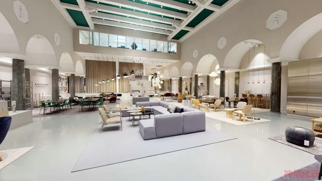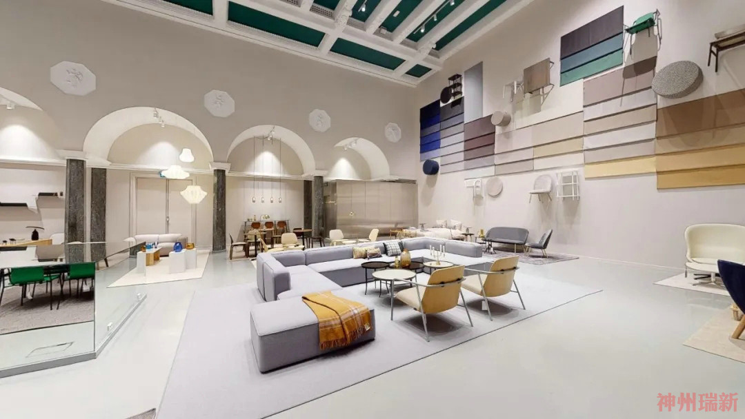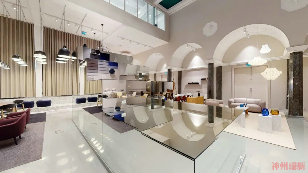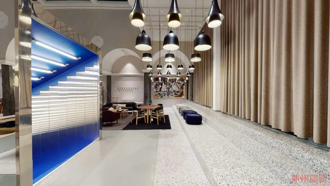以前這個場地是電影院,后來搬離了之后,被展廳商家所用,這個大展廳開放式展示了以前的電影院禮堂的輝煌。這次大改造的結果是柔和的沙色、灰白色和駝色,輔以醒目的綠色和藍色。