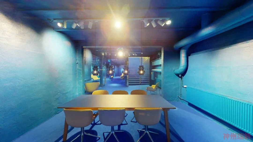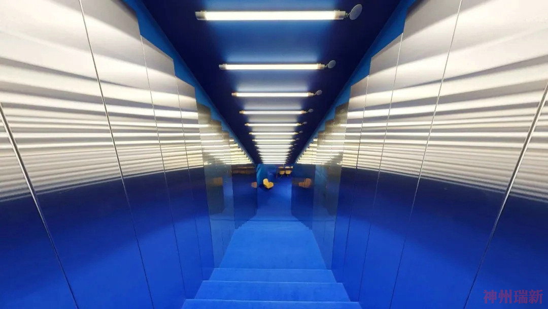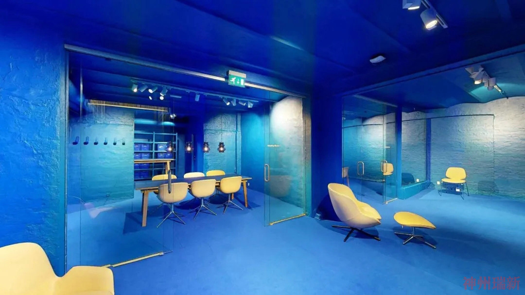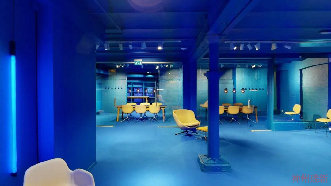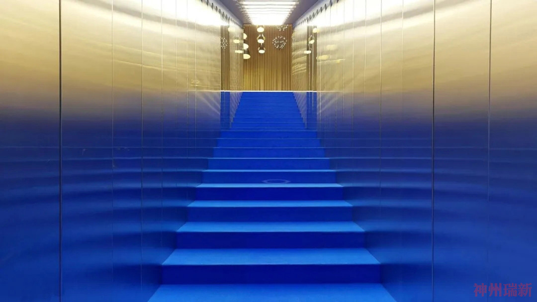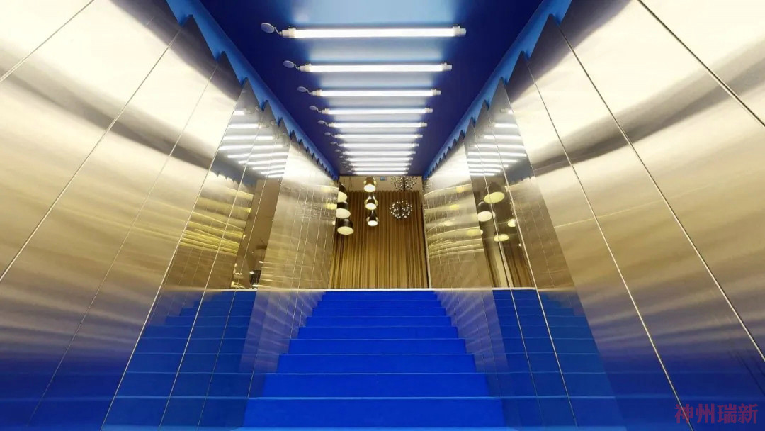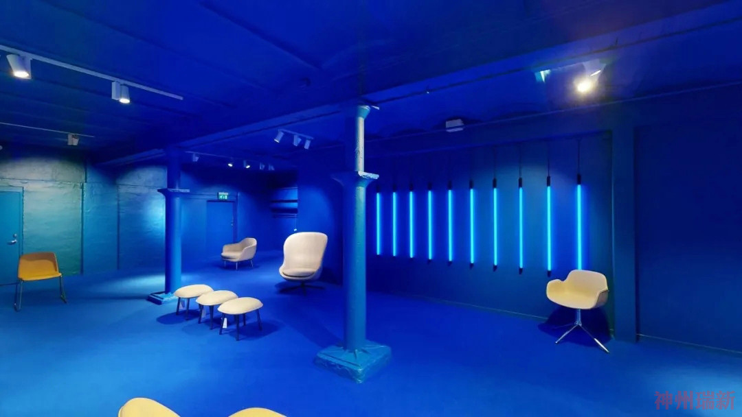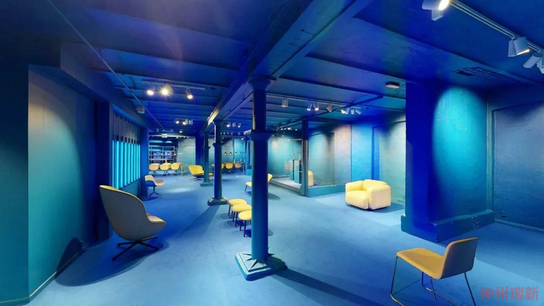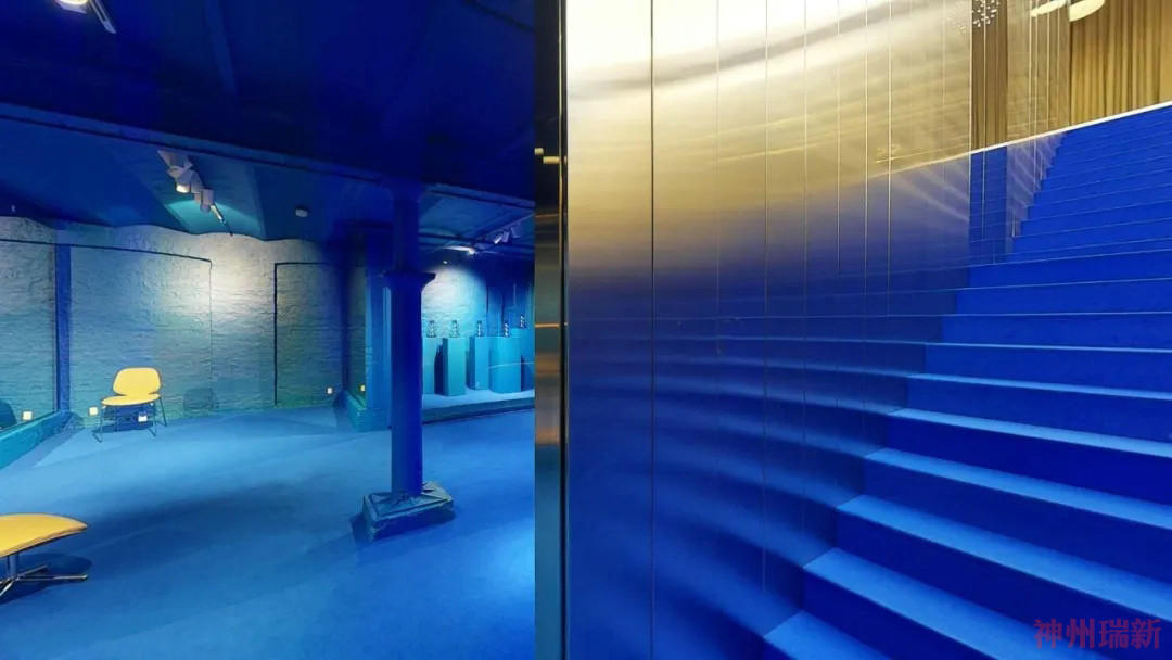 樓下的畫廊看到了另一種身臨其境的轉變。在經歷了從千禧粉到新金的夢幻色彩設置后,展廳最具實驗性的部分現在浸在了深藍色中。