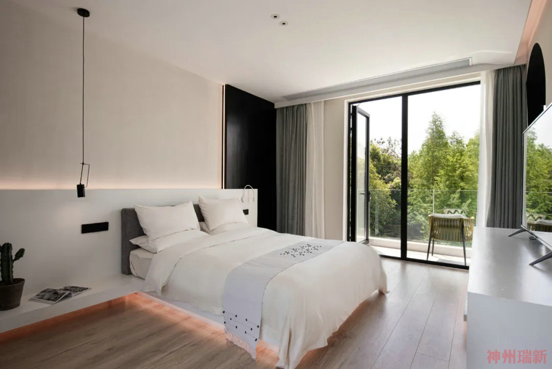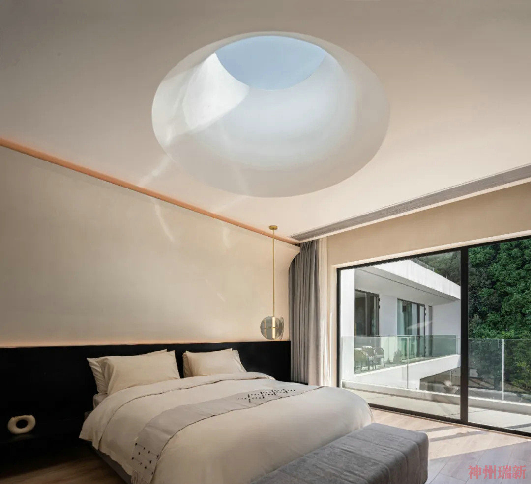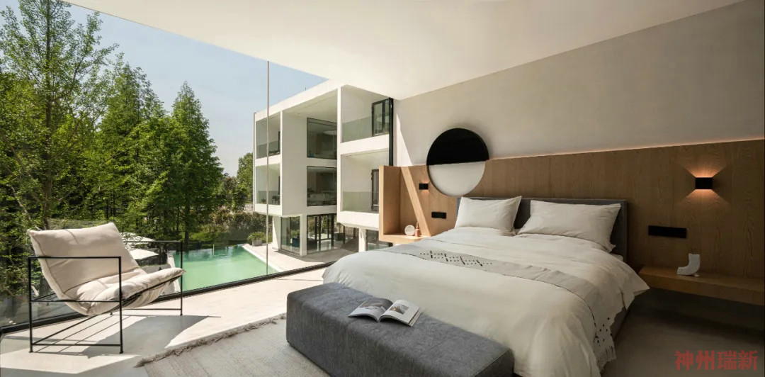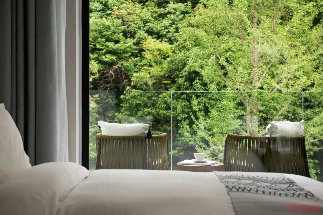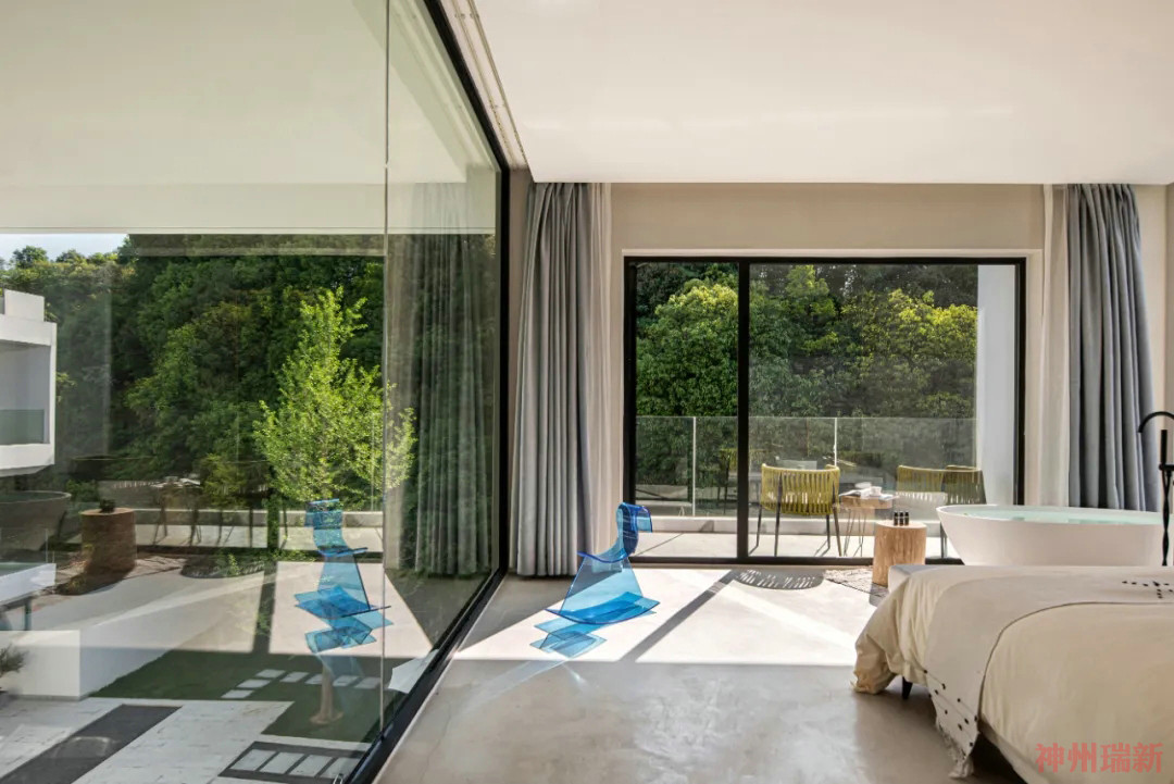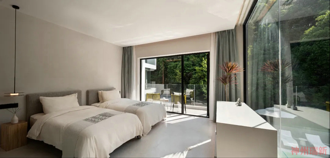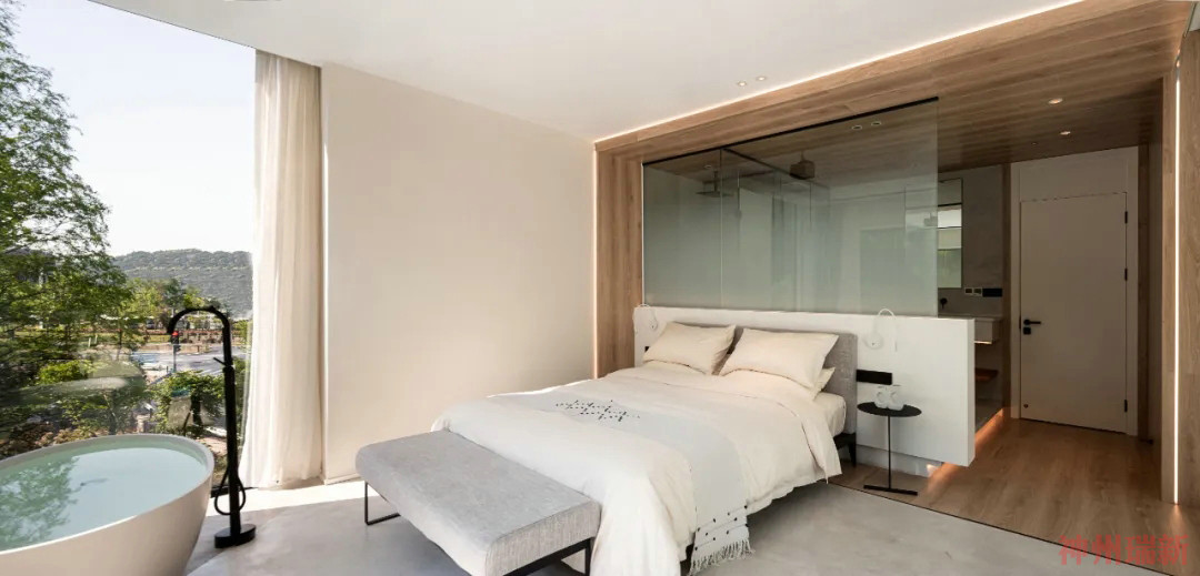 神州瑞新設(shè)計師希望每間房都能映出室外的風(fēng)景,房間有著270°落地玻璃窗,空間變得通透純凈。