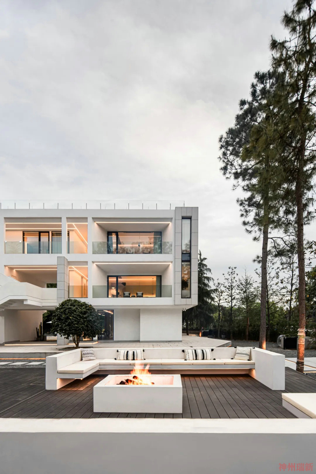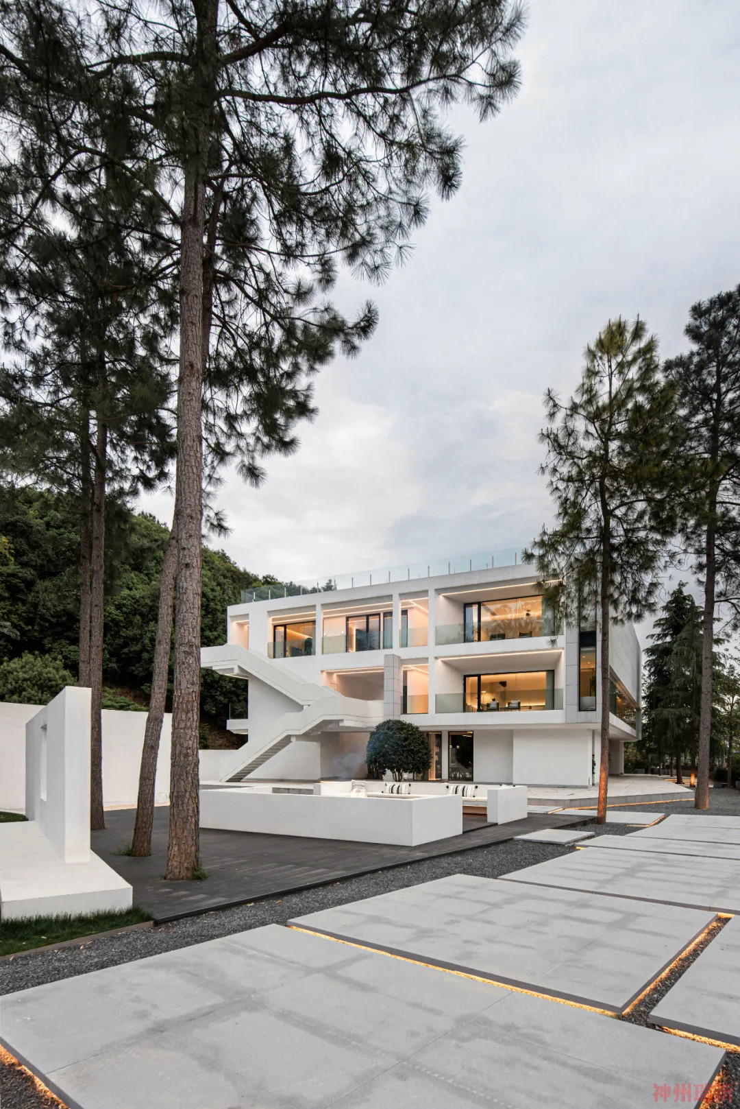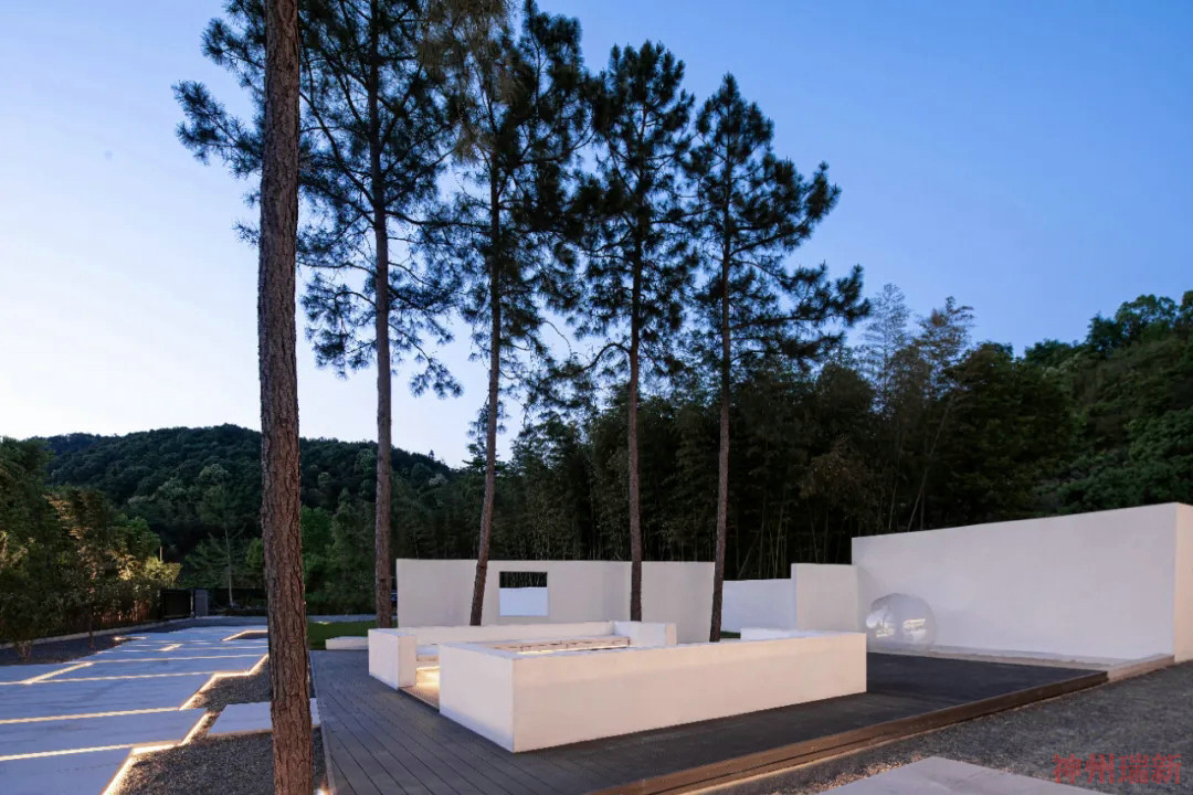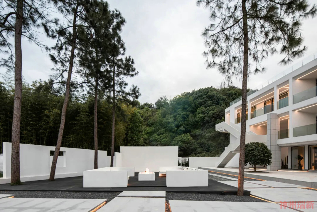 通過交錯鋪設(shè)的汀步走道,來到庭院處,這里特別設(shè)置了篝火派對區(qū),白色立體墻面為空間增加了亮點,在夜晚的燈光映襯下顯得富有造型感。