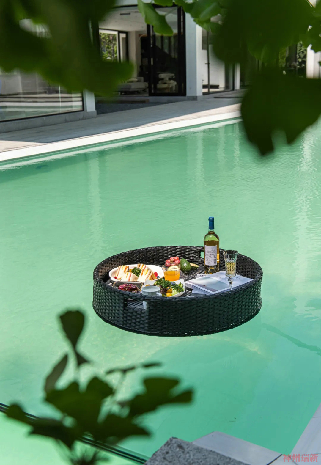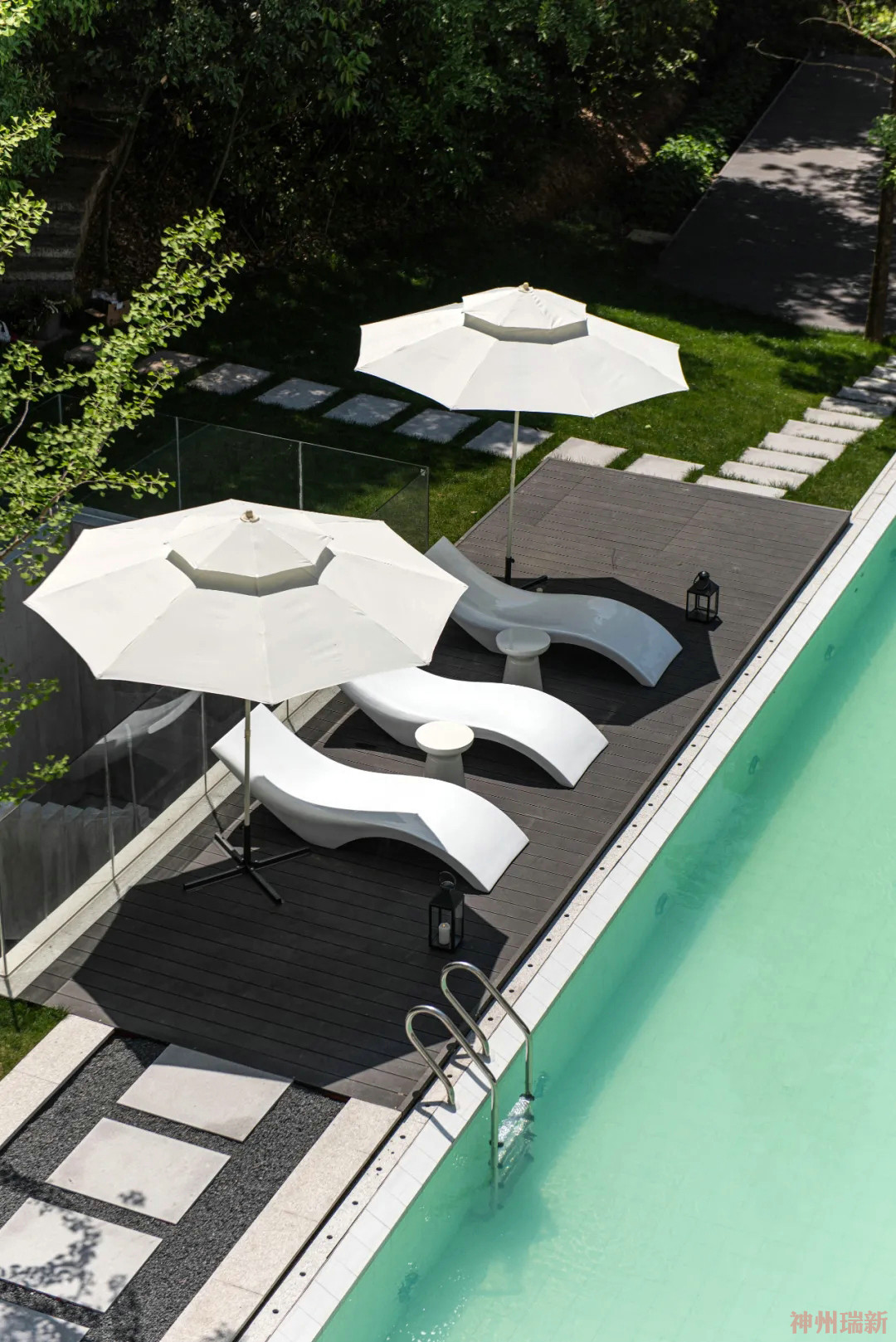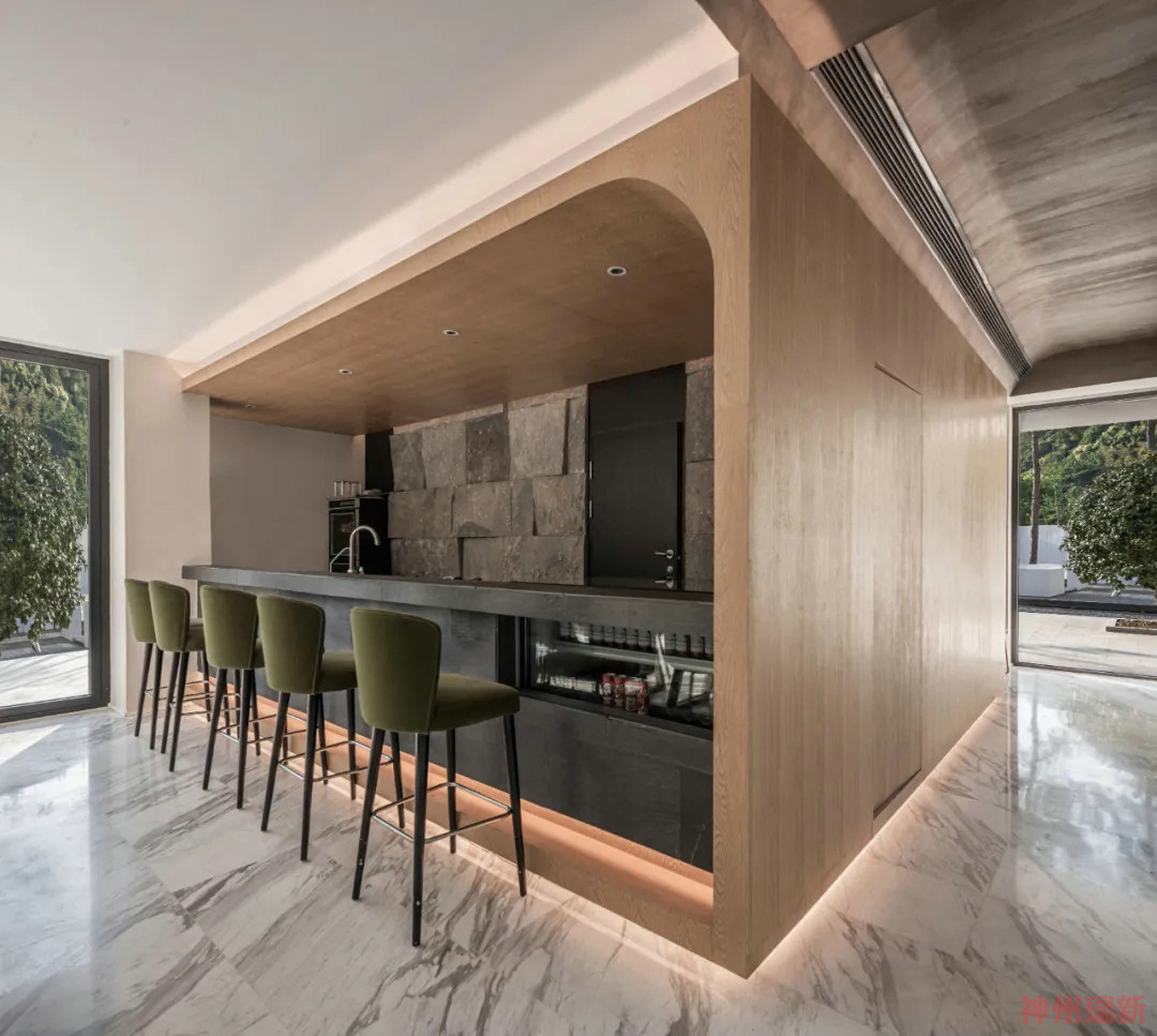 碧綠的泳池讓山與水相呼應(yīng),呈現(xiàn)出最自然最美的狀態(tài),泳池旁能夠通往地下室,設(shè)有地下酒吧。