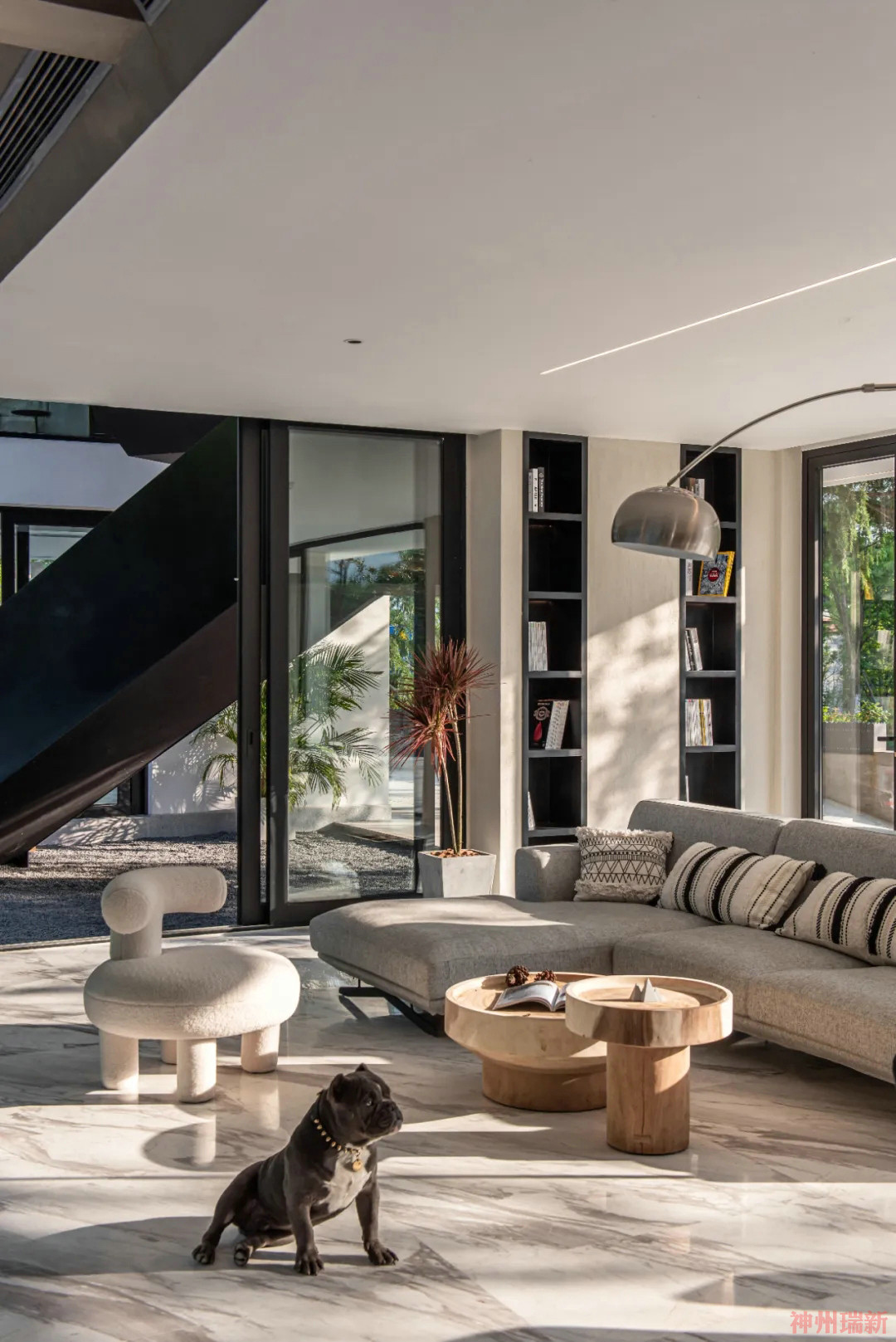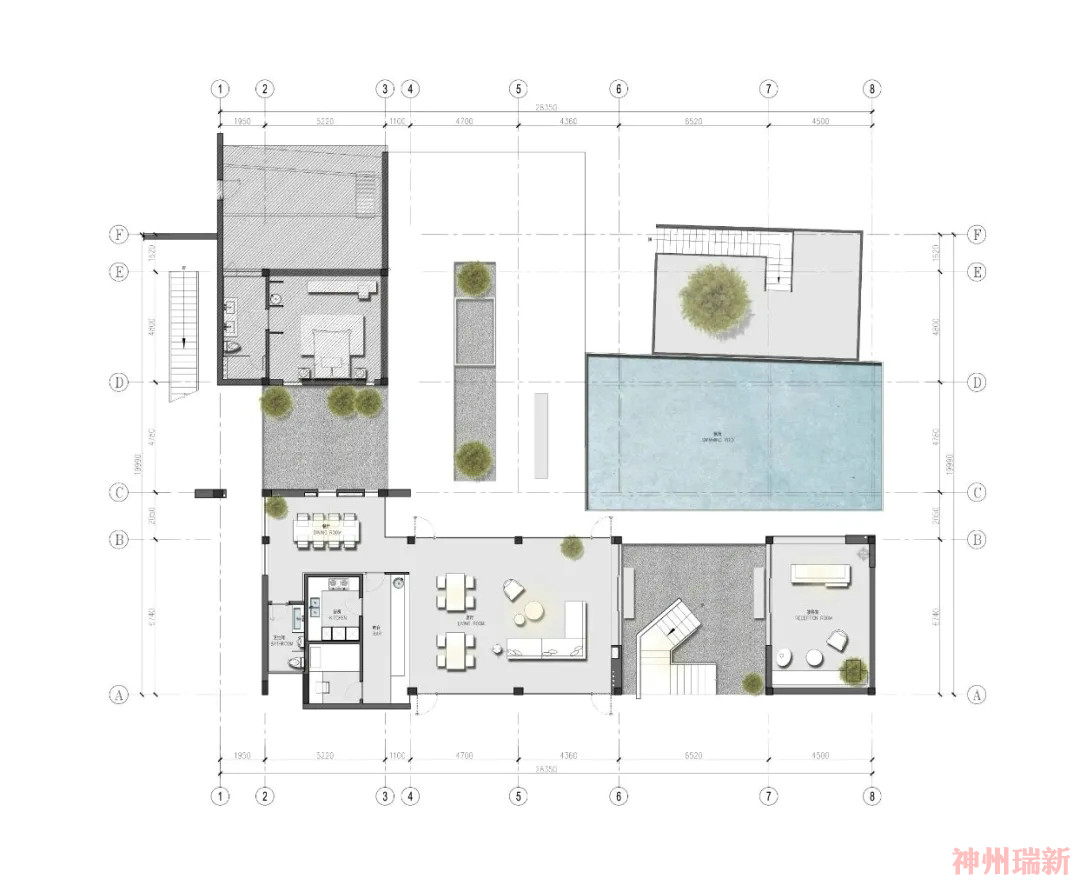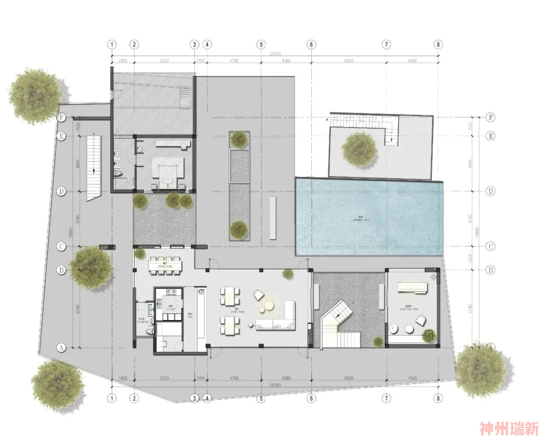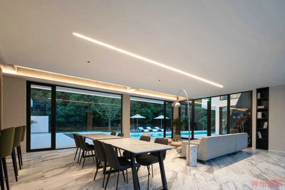 步入室內(nèi),一層客廳采用全敞開式設(shè)計,270°落地窗,能夠讓杉林景觀映入室內(nèi),住客能夠自由穿梭在其中。