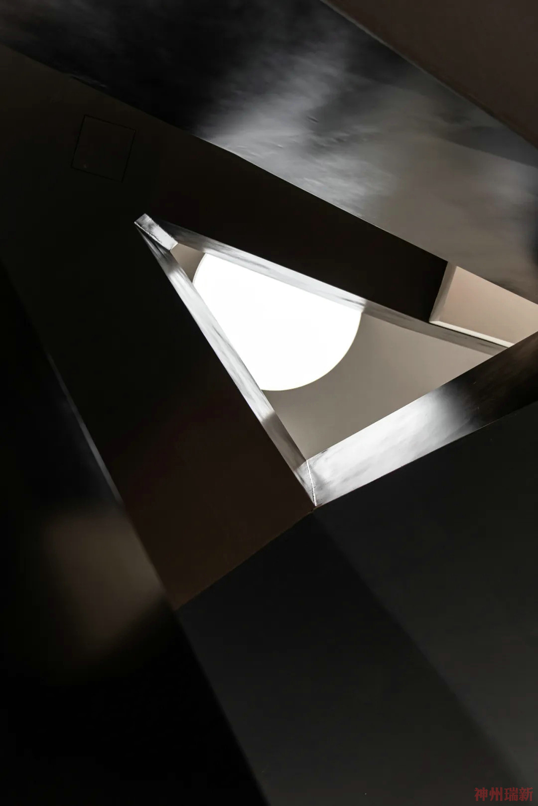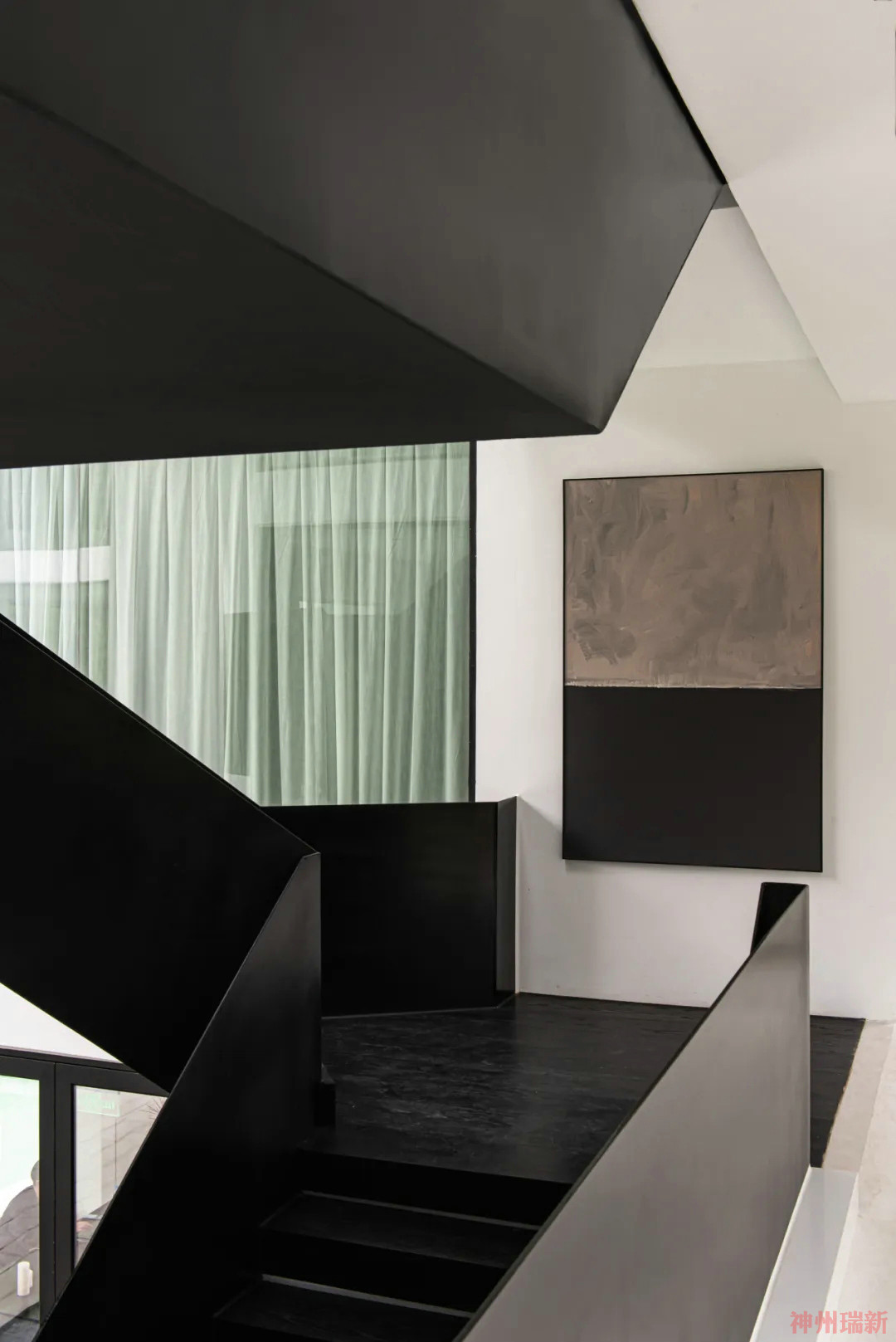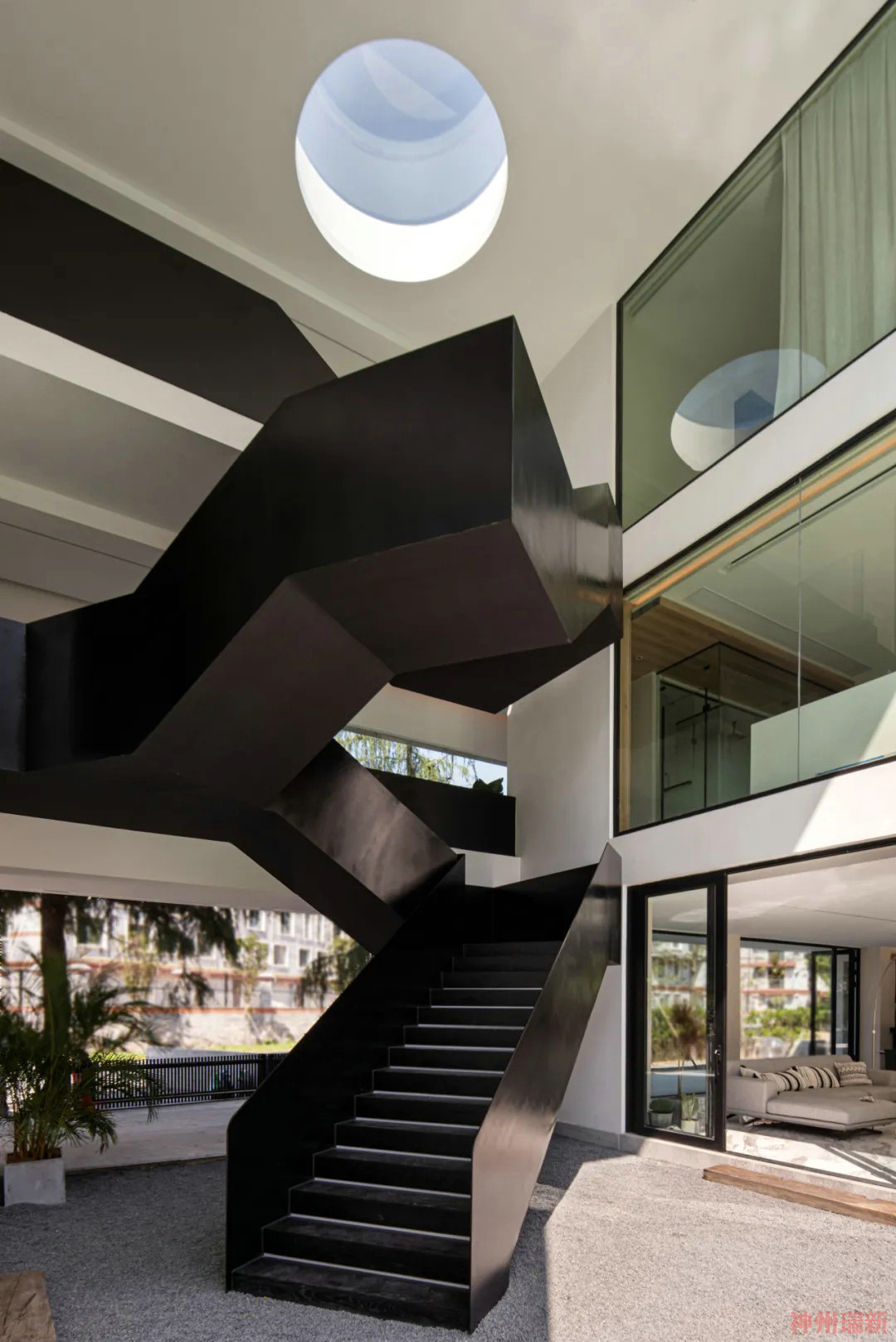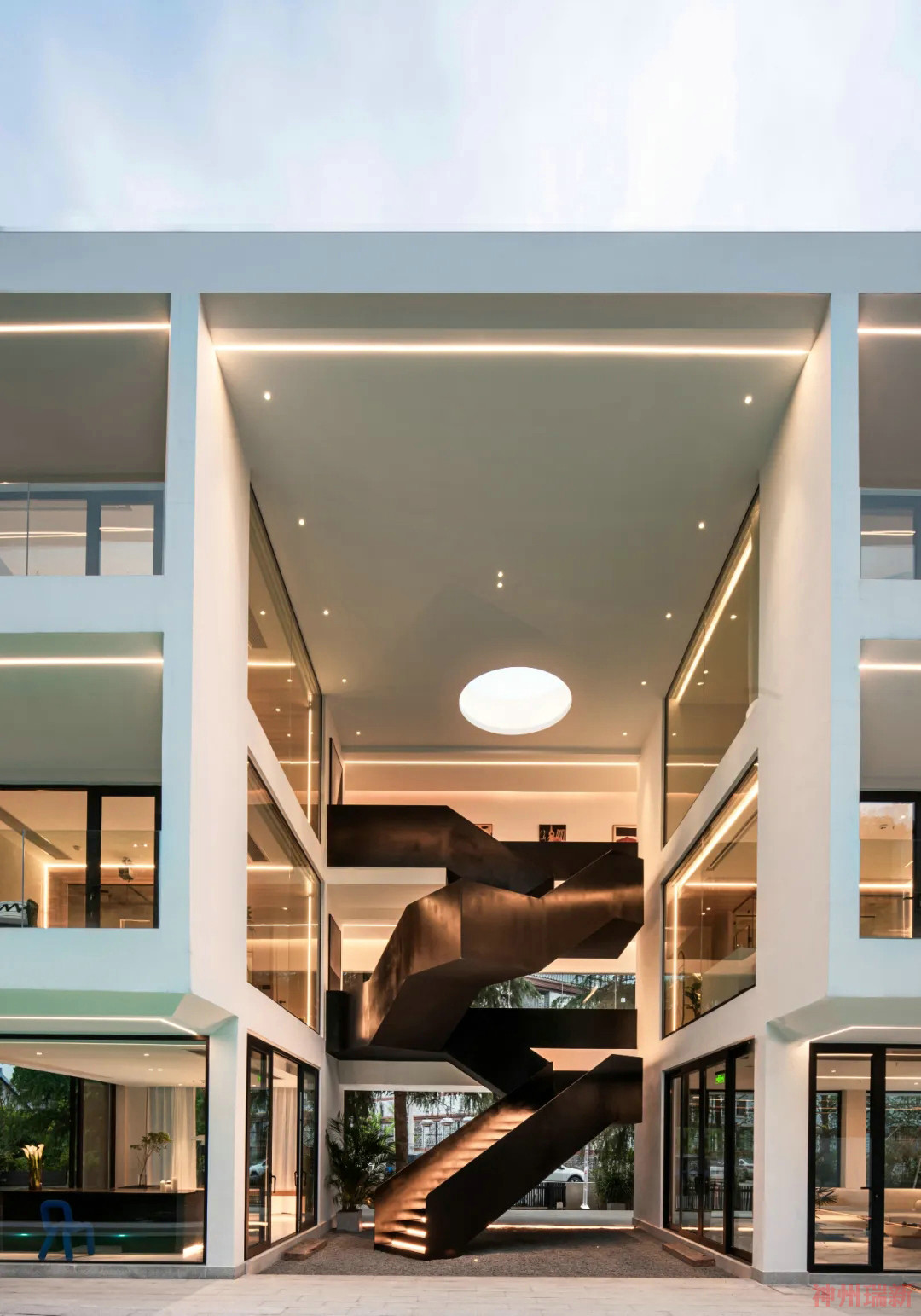 充滿力量感的樓梯將建筑相連,頂部的圓形天窗讓光線照亮整個樓梯,抬頭便可以延伸出天空中,增加了空間感與互動性。