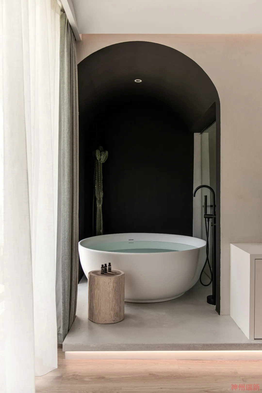 拱圓造型的門框內(nèi)放置浴缸,像是一個儀式感,住客能在此享受安靜不被打擾的私人空間。