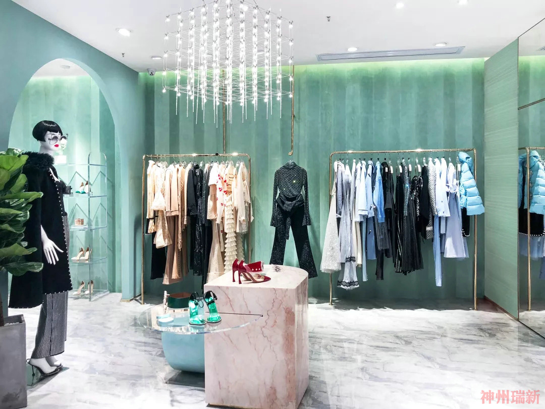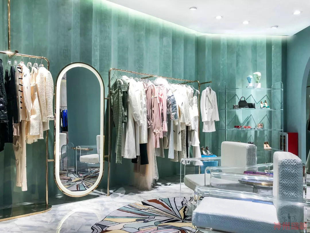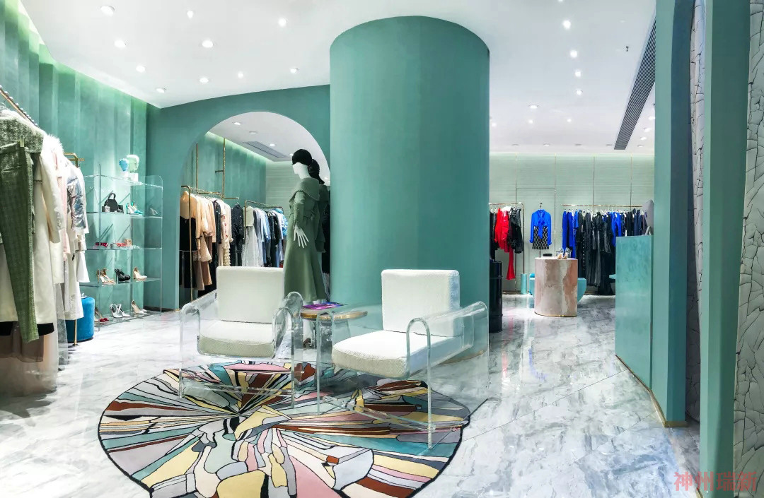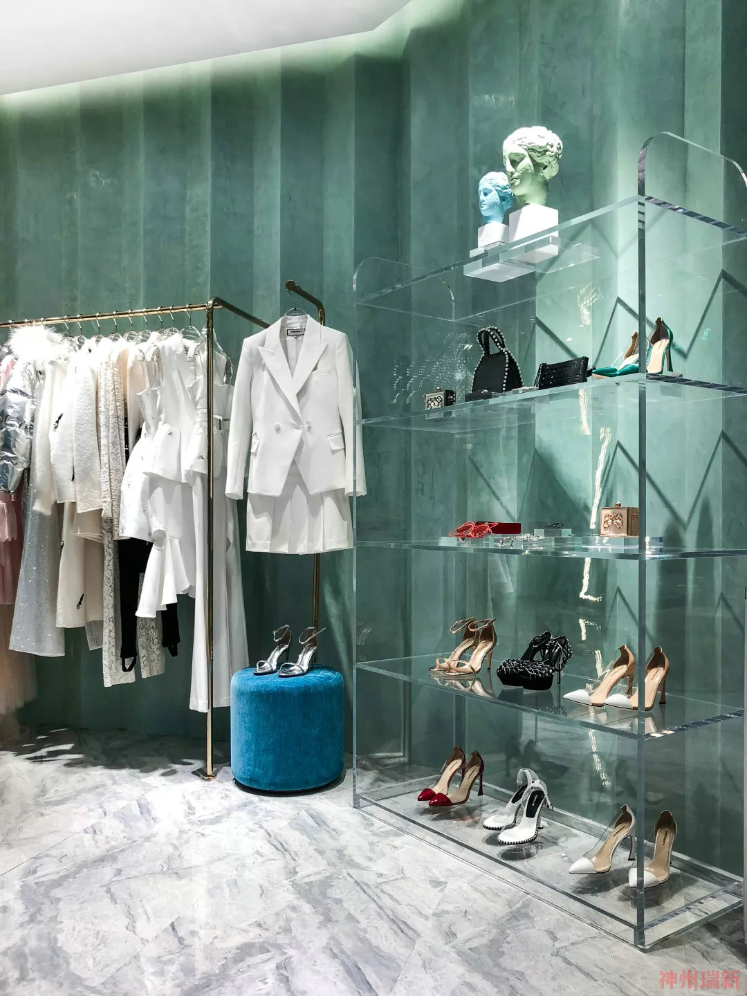 空間以淡淡的孔雀綠為主體色調,搭配精致復古的古銅色金屬材質和溫柔的水粉色石材,以透明亞克力材質作為單品點綴,前衛不失優雅。大面積的幾何元素在空間中相互疊加,新奇的顏色和不同觸感材質的碰撞,為空間增添了無限活力和時髦趣味。