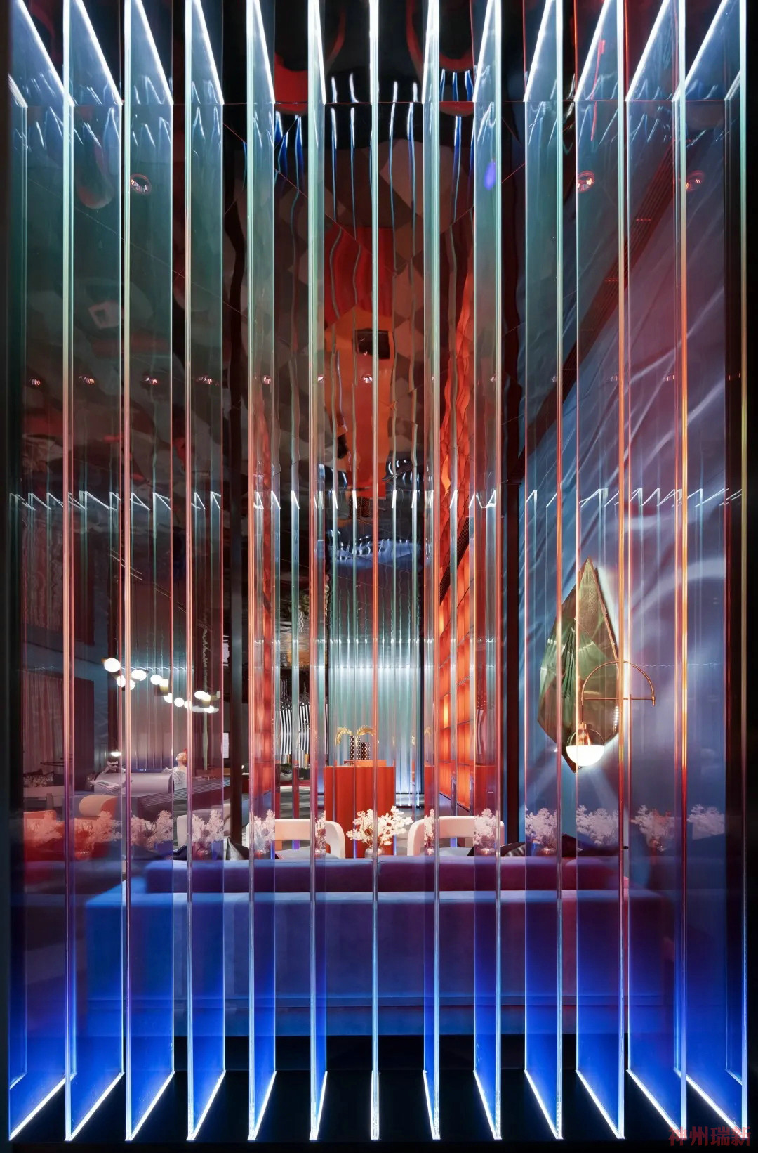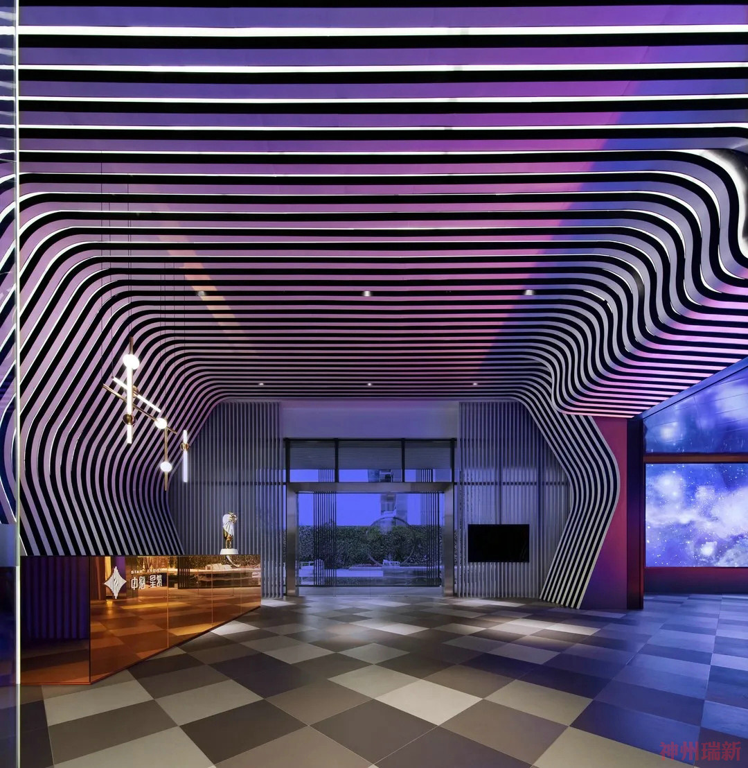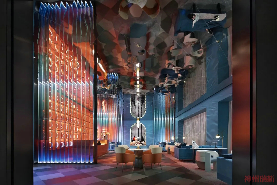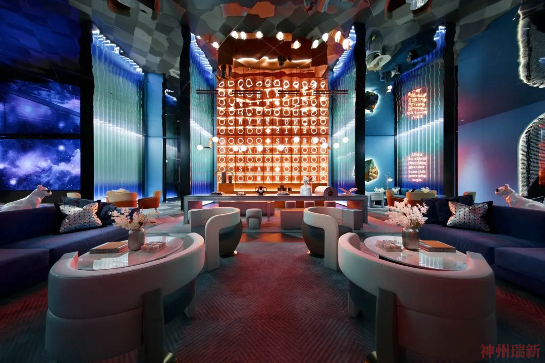 神州瑞新設(shè)計(jì)運(yùn)用一種空間視覺焦點(diǎn)引導(dǎo)手法,不同程度的將空間中線條、體塊以不同程度的重復(fù)與疊加呈現(xiàn),加以不同色彩的玩轉(zhuǎn)異動,讓人浸入體驗(yàn)到一個似是全息的彩色時光隧道