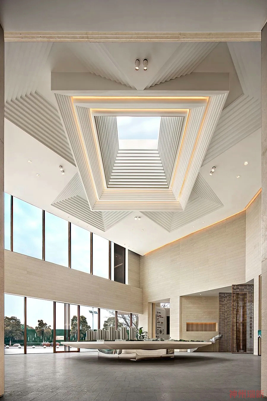 較為單一克制的黑白條紋以不斷重復(fù)的形態(tài)遞進(jìn)構(gòu)建在前廳接待空間當(dāng)中,以“黑洞”為概念為“時空”的縱深感塑造層次,聚焦觀者視覺落點(diǎn)