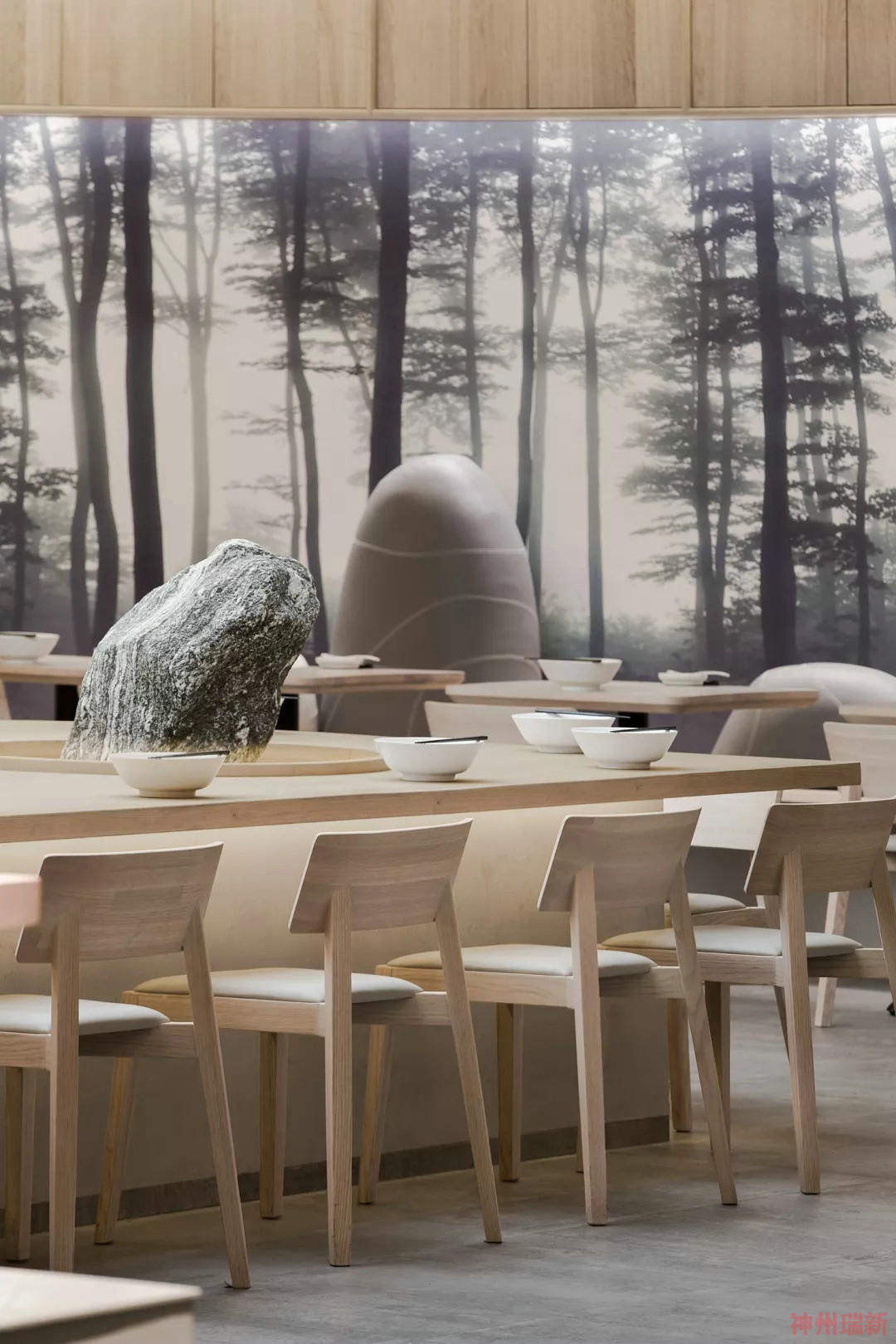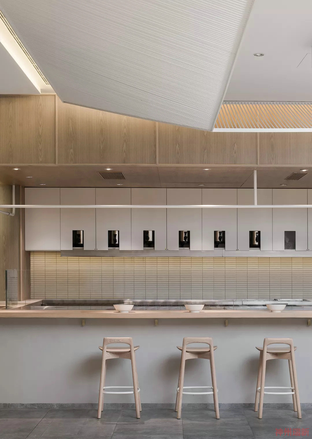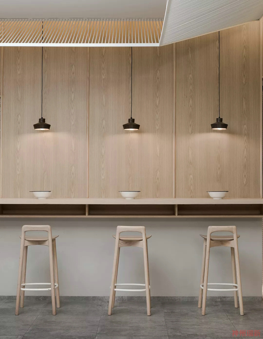 能容下近20人的大吧桌將面館轉化為共享空間,方形的共享桌子中心,是神州瑞新精心設計的微小景觀,即使是一碗面的時間,神州瑞新設計師也希望將心靈帶到安靜的山水遠方。