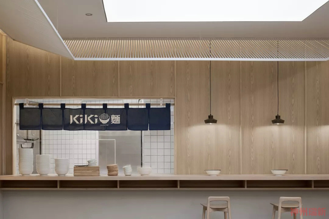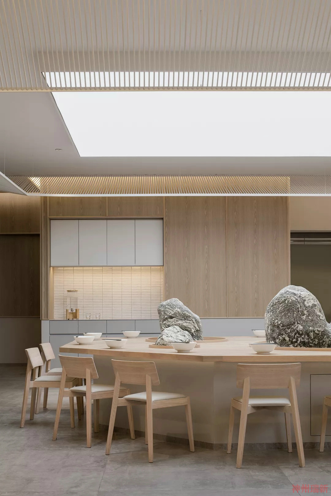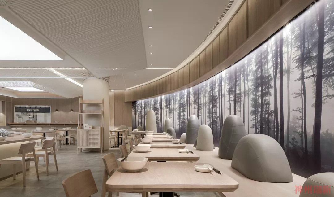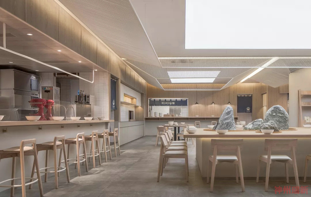 能容下近20人的大吧桌將面館轉化為共享空間,方形的共享桌子中心,是神州瑞新精心設計的微小景觀,即使是一碗面的時間,神州瑞新設計師也希望將心靈帶到安靜的山水遠方。