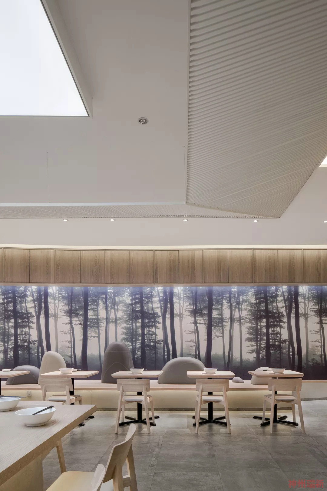 這一處空間,竟然是希望人們坐在天井之下的庭院,靜靜眺望遠處的風景。所以本來應該是熱鬧擁擠的面館設計成這樣的寬敞氛圍,也不過是想要在此處給來往的人一個小憩的場所,看看眼前的山水,“遠眺”庭院之外的山林,給心靈一個小節的放空。