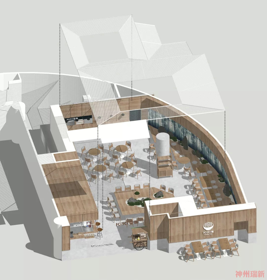同時在功能上,這一出的空間是個弧面,神州瑞新設計師將視覺上依舊保持一個弧面的效果,如同全景的落地窗,將景色盡收眼底,但在使用上,卡座層層疊級,又是一個個矩形的單元。