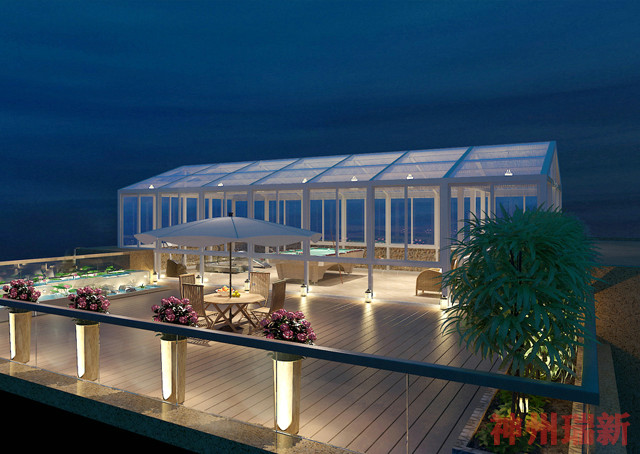 5、空中別墅因處在頂層,神州瑞新在戶型的設計上可以處理得非常獨到,比如超大的觀景玻璃幕墻、直通屋頂花園的專有通道、通天玻璃頂棚的陽光房等,以顯示出與眾不同。并且同類套型極少,以體現出稀缺性。